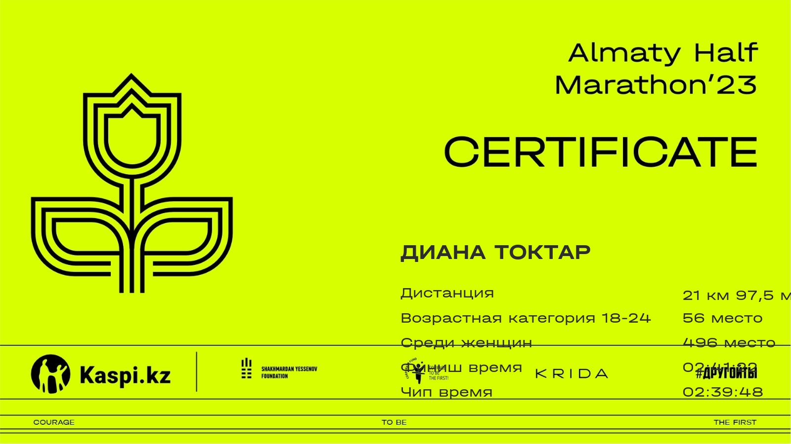 | 2634 | Дина Хуснутдинова | ![]() | Алматы | 134 | 00:34:15.10 | 01:15:33.91 | 01:51:55.22 | 02:33:19.09 | 02:41:20.24 | 02:39:17.65 | Скачать |