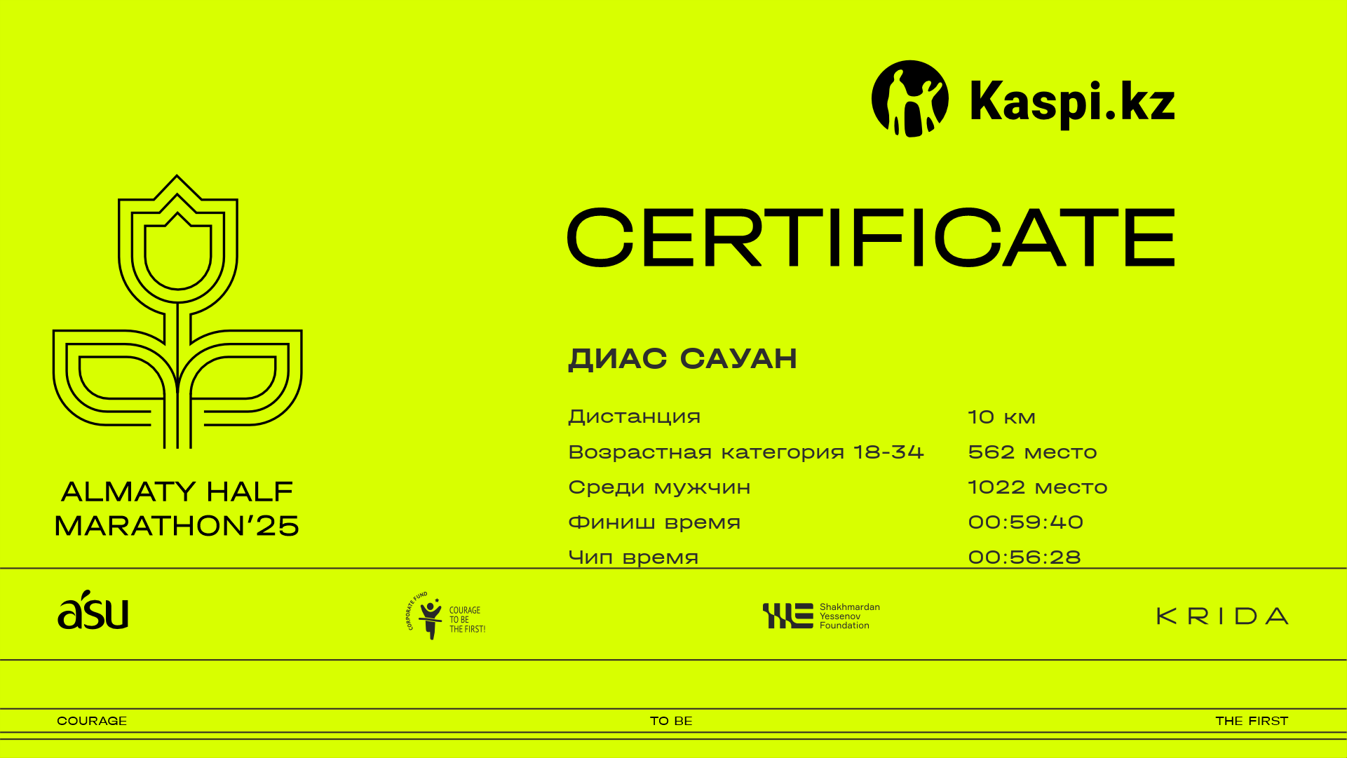 | 1402 | Aibek Kyrykbayev | ![]() | Алматы | 8326 | 00:39:47 | 00:59:37 | 00:58:03 | Скачать |