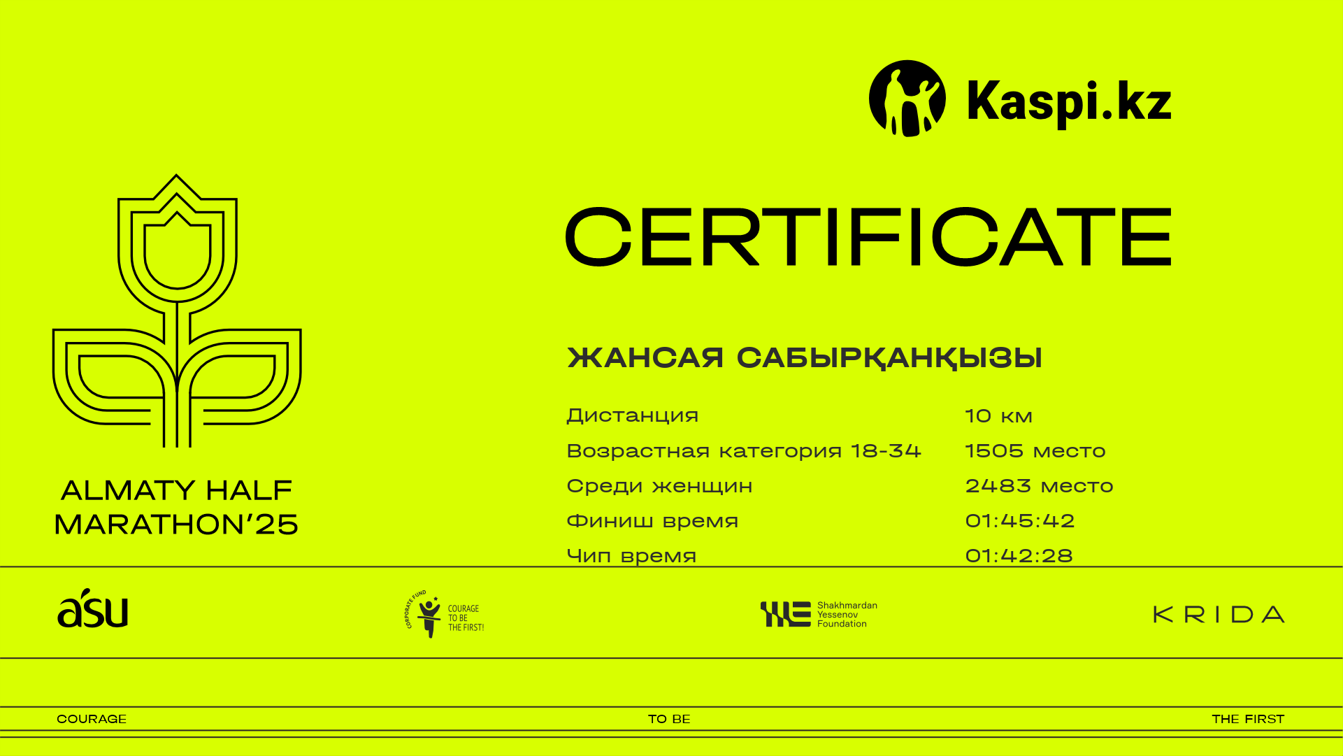 | 5010 | Александра Бекишева | ![]() | Алматы | 7282 | 01:12:09 | 01:46:45 | 01:42:45 | Скачать |