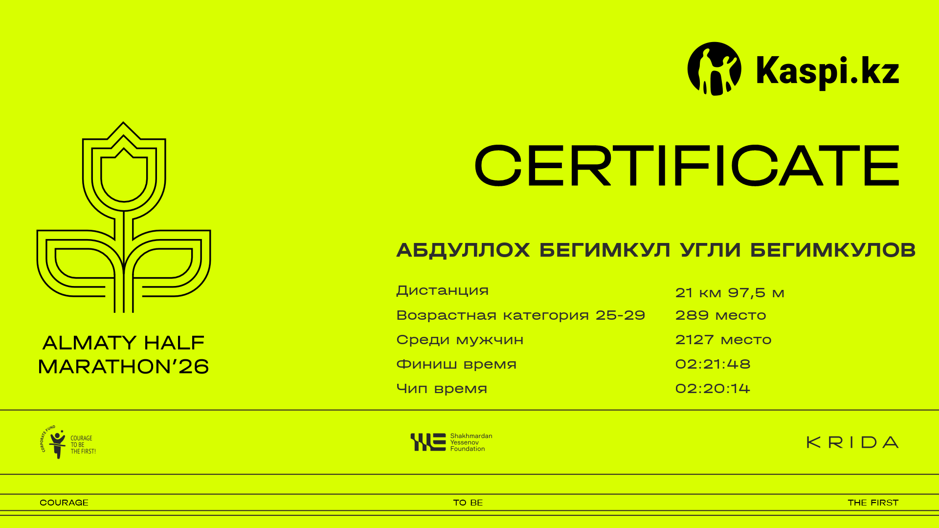 | 2127 | Абдуллох бегимкул угли Бегимкулов | ![]() | Алматы | 2028 | 00:33:38 | 01:08:57 | 01:40:47 | 02:15:09 | 02:21:48 | 02:20:14 | Скачать |