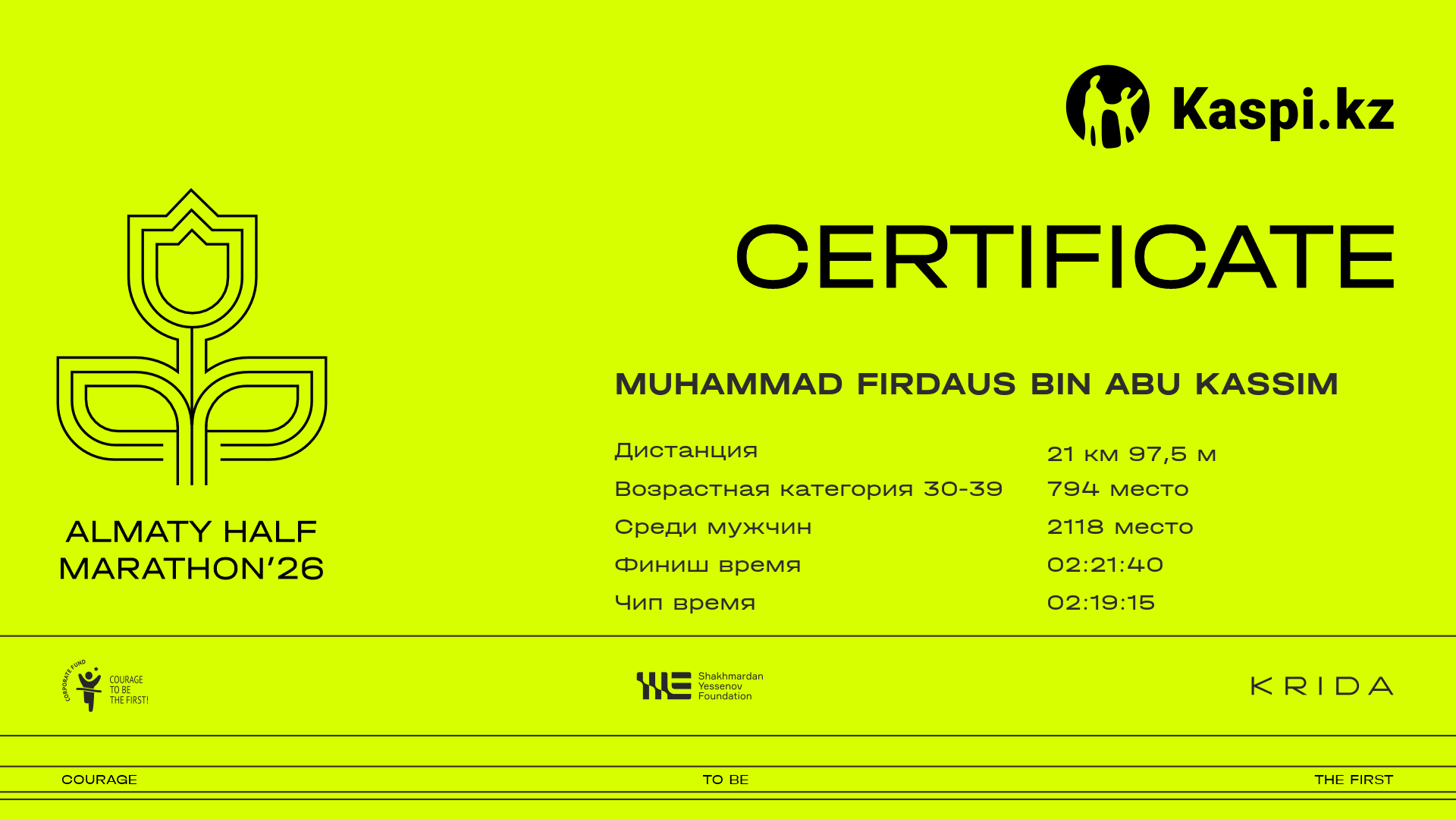 | 2107 | Нұржан Өскенбаев | ![]() | Almaty | 2563 | 00:31:51 | 01:10:13 | 01:42:13 | 02:15:56 | 02:21:28 | 02:19:07 | Скачать |