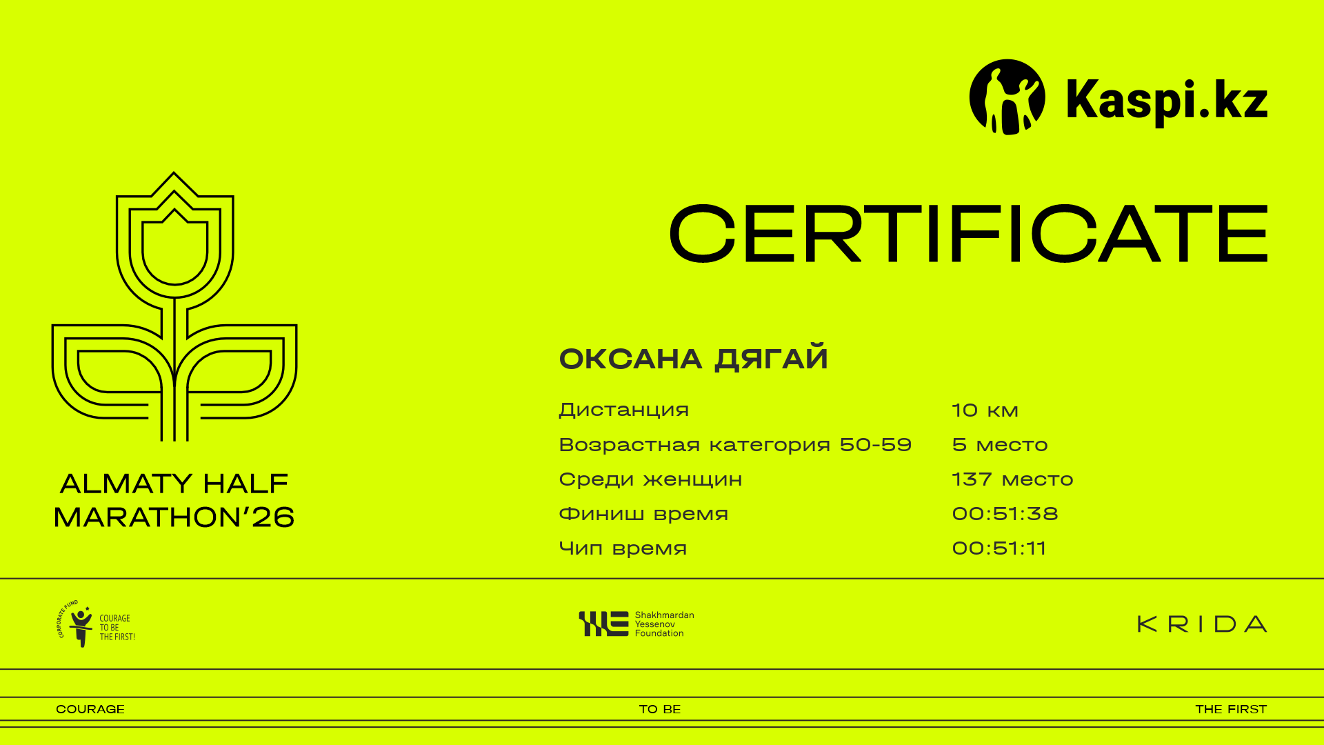 | 137 | Оксана Дягай | ![]() | Алматы | 7535 | 00:25:17 | 00:33:44 | 00:51:38 | 00:51:11 | Скачать |