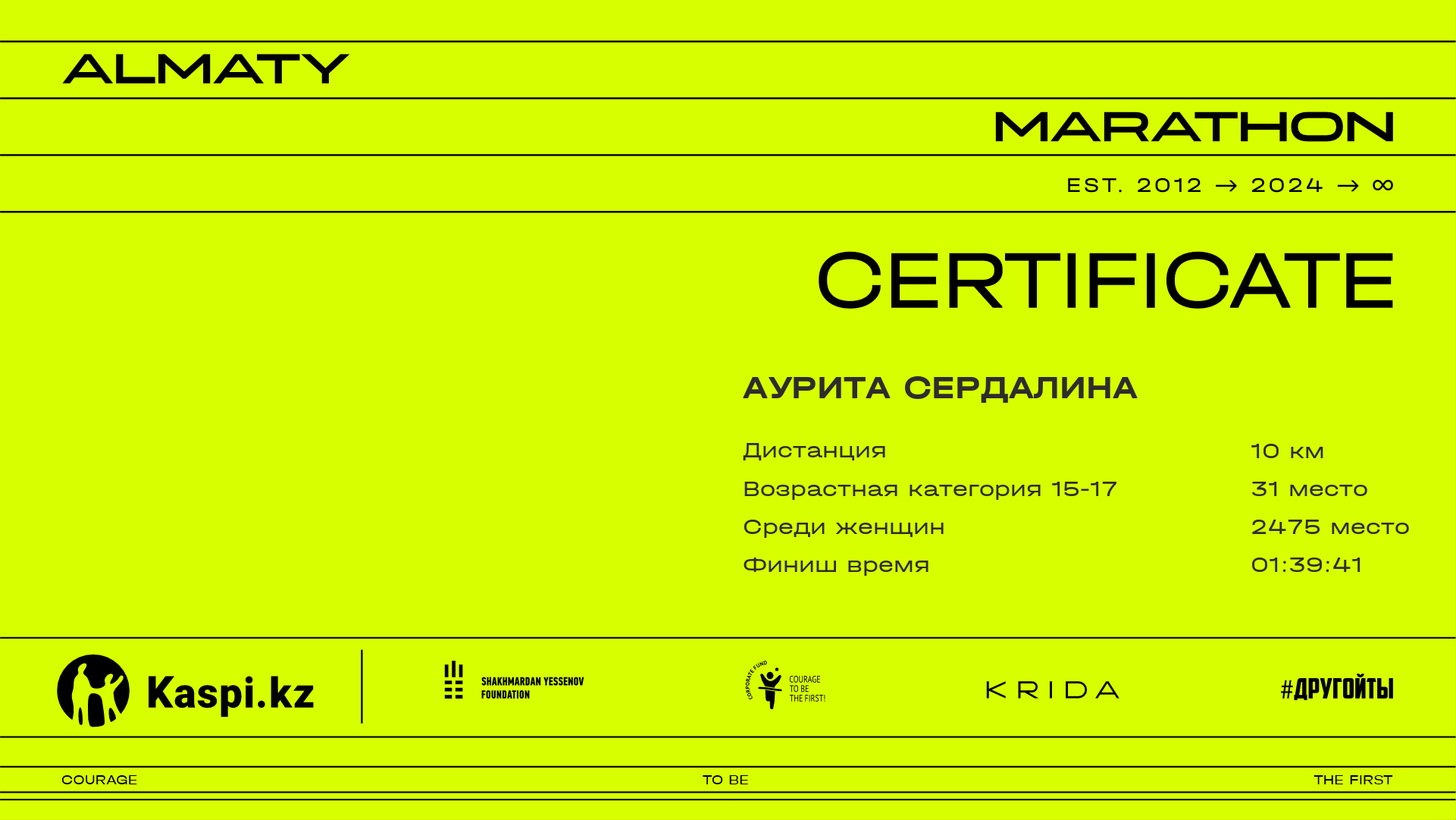 | 5258 | Лаура Гелиева | ![]() | Алматы | 7711 | 01:13:57.41 | 01:39:03.15 | 01:34:49.71 | Скачать |