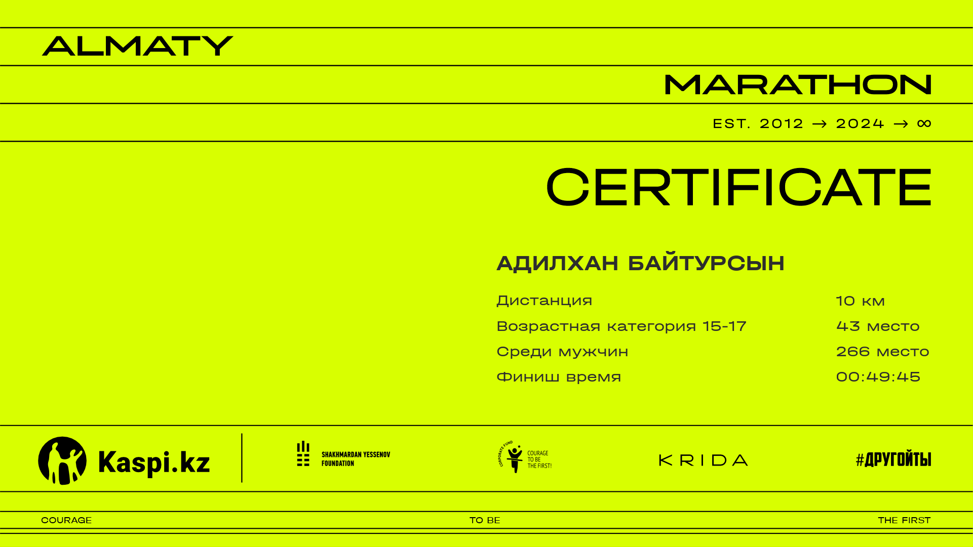 | 297 | Ерден Жумагулов | ![]() | Алматы | 7095 | 00:37:15.25 | 00:49:46.64 | 00:47:48.62 | Скачать |