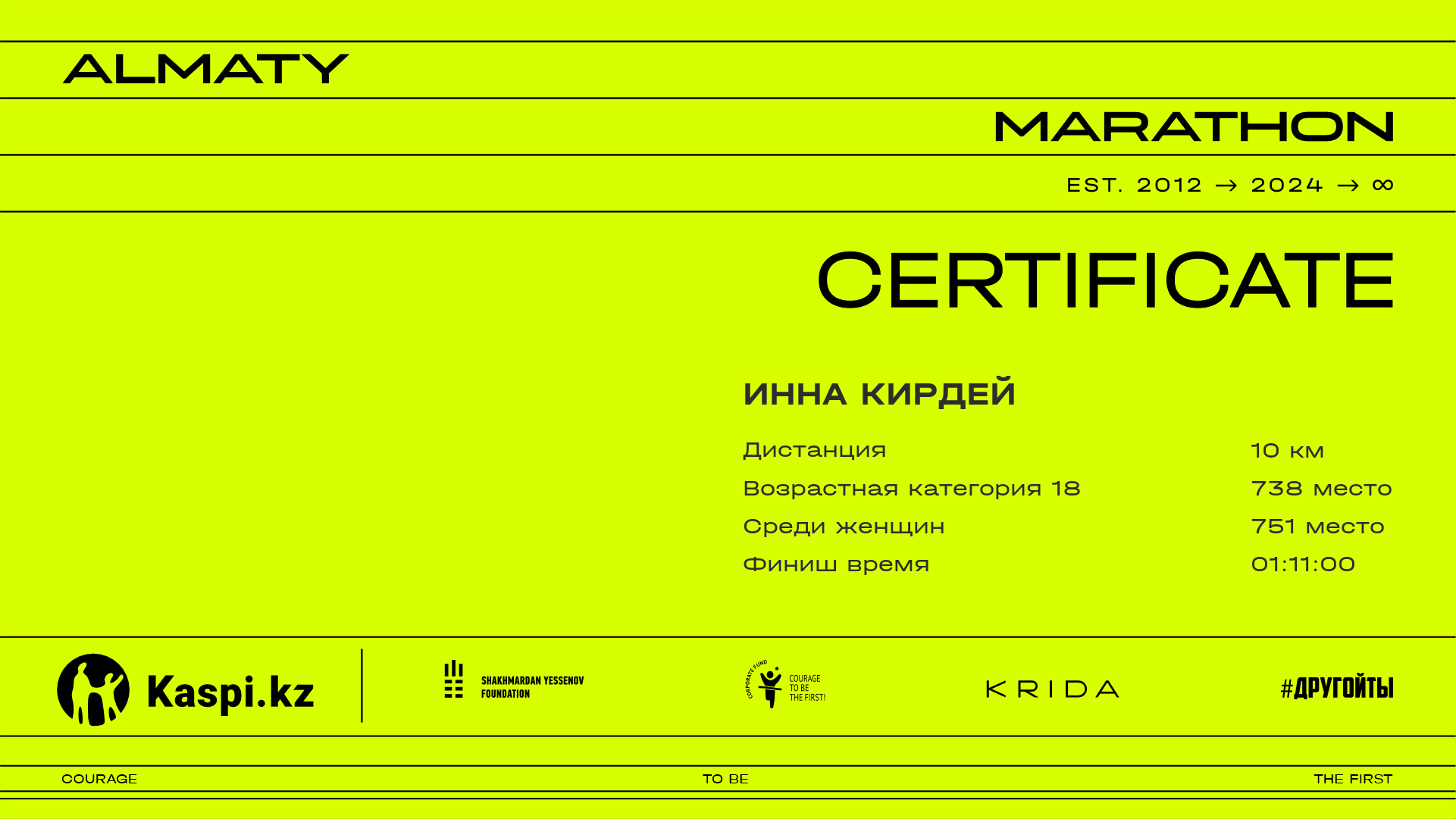 | 2580 | Инна Кирдей | ![]() | Алматы | 5040 | 00:52:28.16 | 01:11:00.37 | 01:07:30.28 | Скачать |