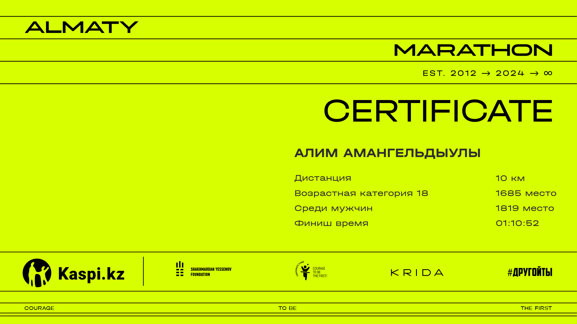 | 4819 | Мухтар Сальменов | ![]() | Алматы | 8414 | 01:07:43.28 | 01:29:32.68 | 01:29:32.68 | Скачать |
