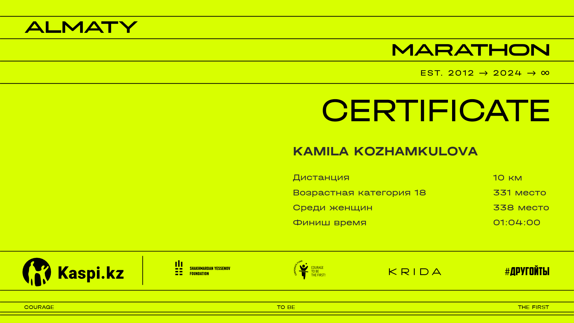 | 424 | Karakoz Togussova | ![]() | Шымкент | 5075 | 00:38:18.54 | 00:52:21.52 | 00:51:57.55 | Скачать |