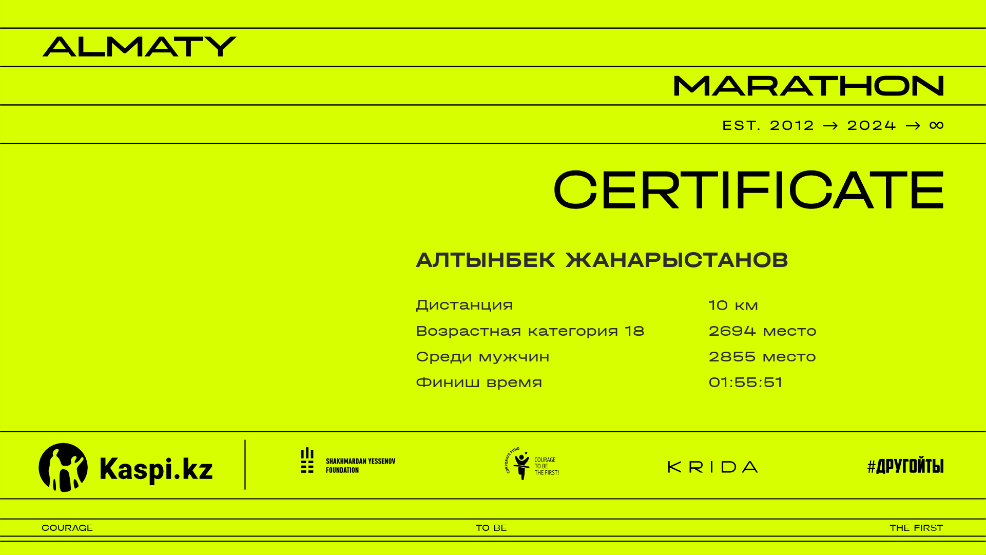 | 5518 | Алтынбек Жанарыстанов | ![]() | Алматы | 7189 | 01:25:29.37 | 01:55:51.89 | 01:51:52.99 | Скачать |