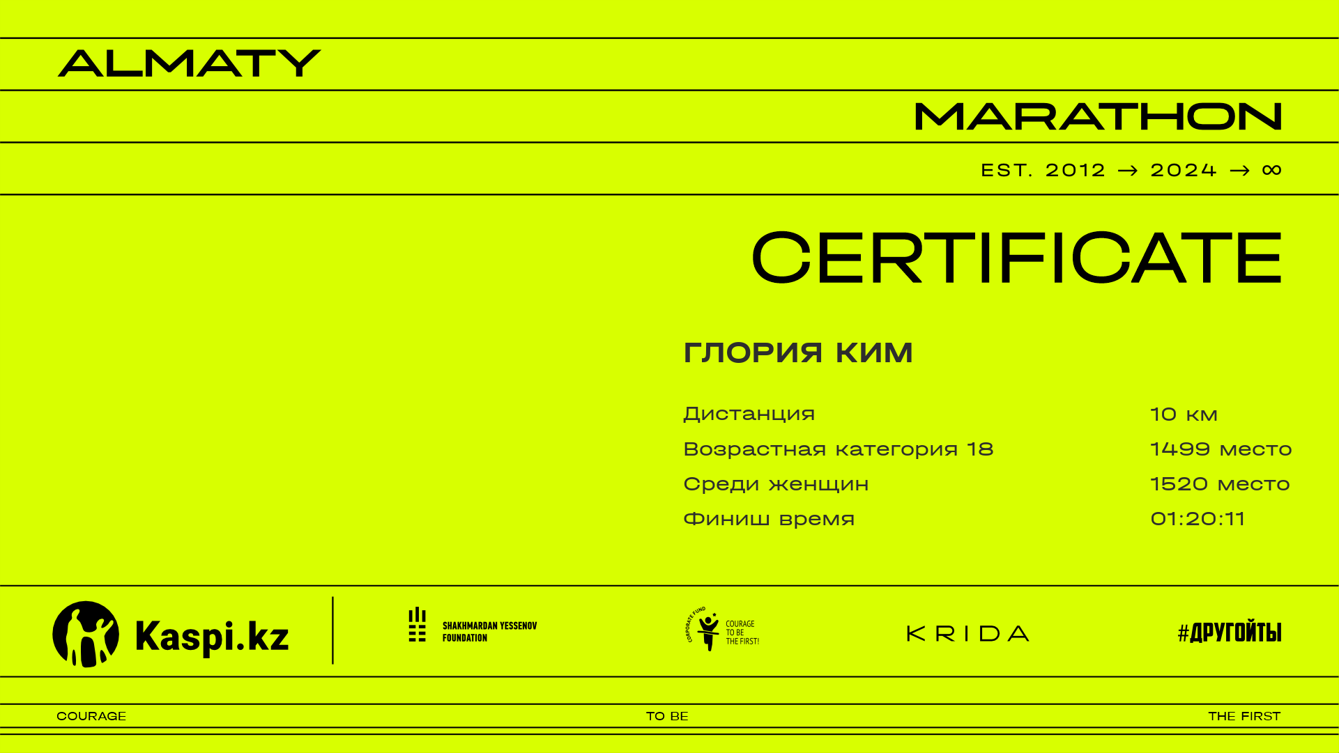 | 3935 | Глория Ким | ![]() | Алматы | 9169 | 00:58:12.12 | 01:20:11.19 | 01:19:10.41 | Скачать |