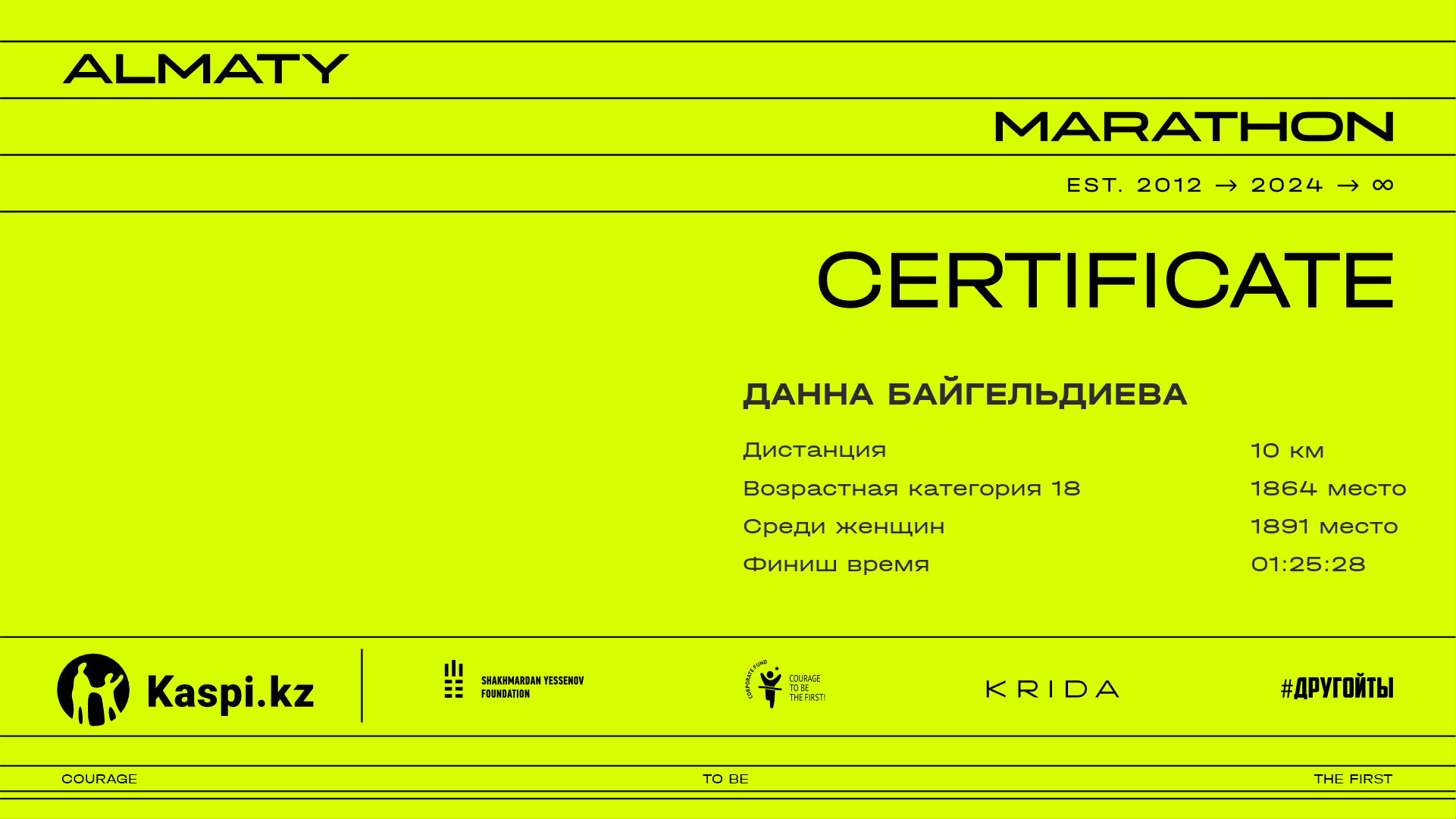 | 4488 | Данна Байгельдиева | ![]() | Алматы | 9062 | 01:02:19.34 | 01:25:28.88 | 01:25:10.00 | Скачать |