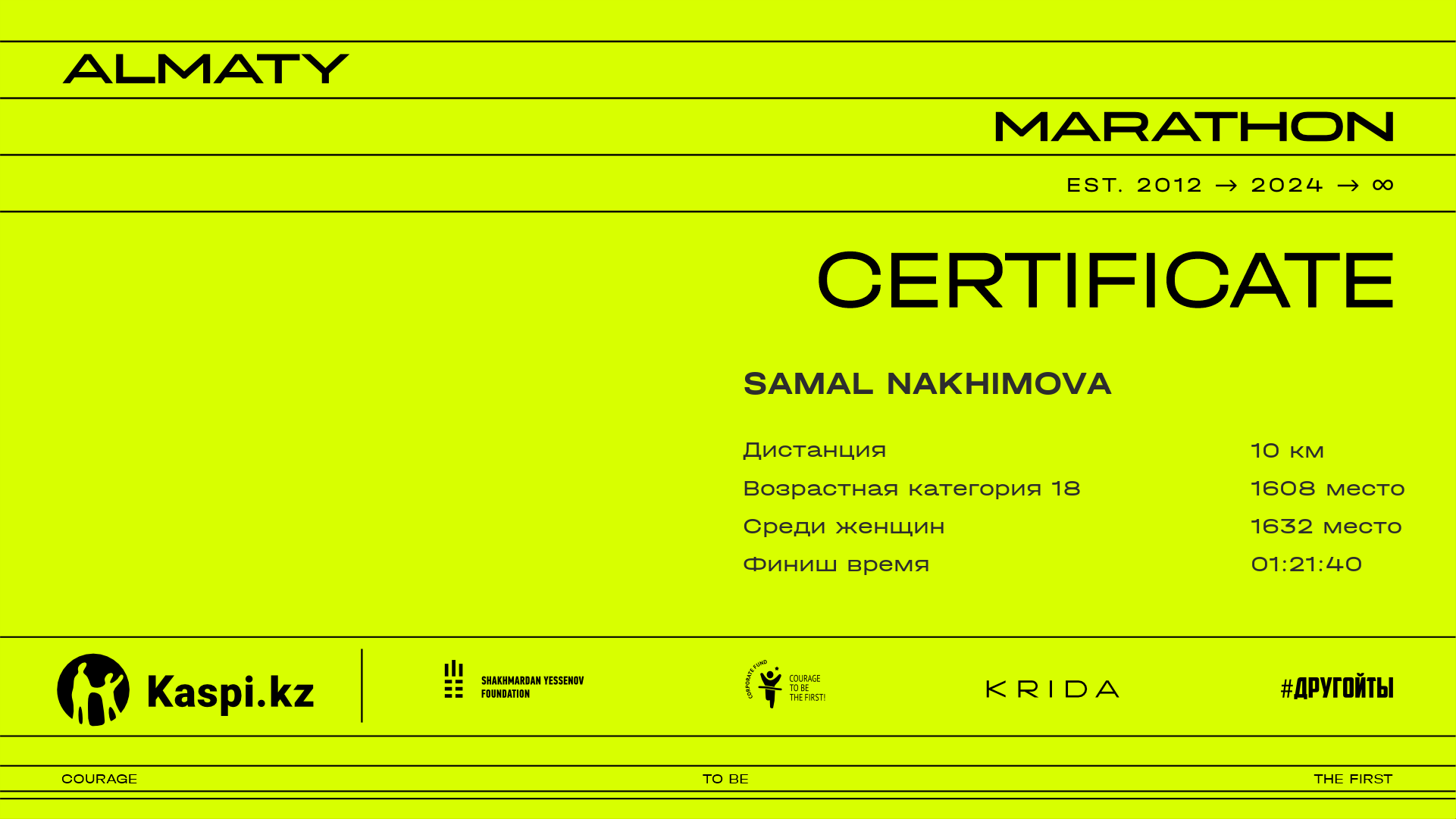 | 4165 | Фарида Ахметова | ![]() | Алматы | 10081 | 00:59:50.47 | 01:22:06.92 | 01:20:43.77 | Скачать |