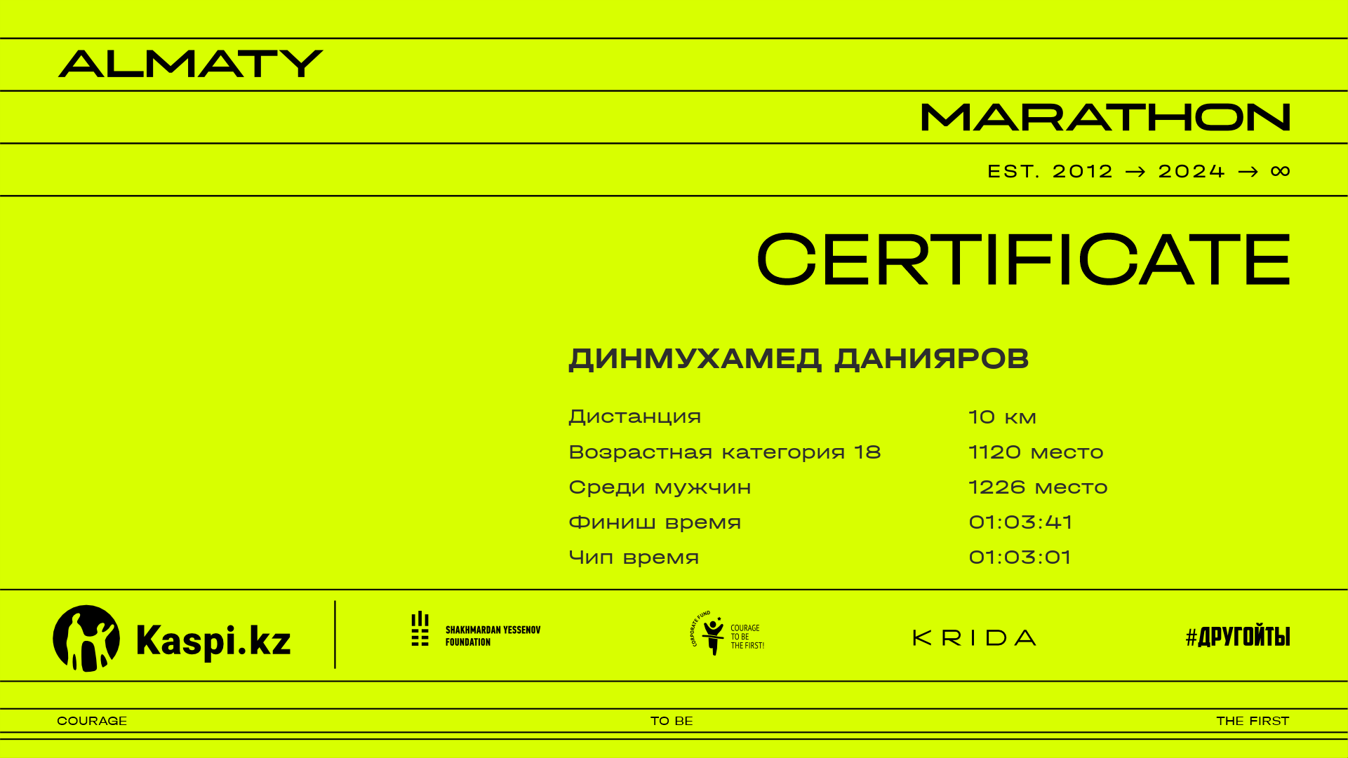 | 4286 | Кумар Ахмадиев | ![]() | Almaty | 8310 | 01:03:13.71 | 01:23:28.45 | 01:19:32.79 | Скачать |