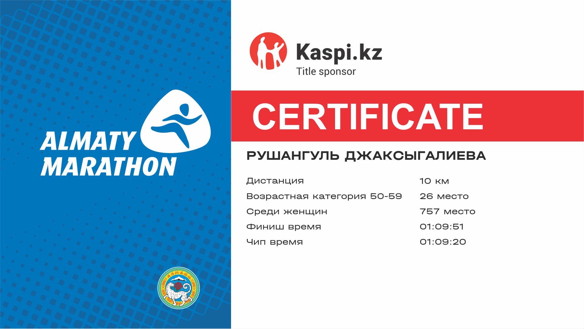 | 6214 | Марина Орынбаева | ![]() | Алматы | 10952 | 01:06:44 | 01:31:20 | 01:27:58 | Скачать |