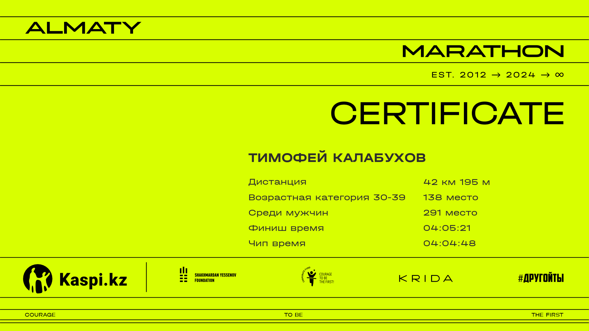 | 306 | Дастан Шайхиев | ![]() | Алматы | 929 | 03:06:34.56 | 03:56:52.94 | 04:04:58.48 | 04:04:58.48 | Скачать | |||