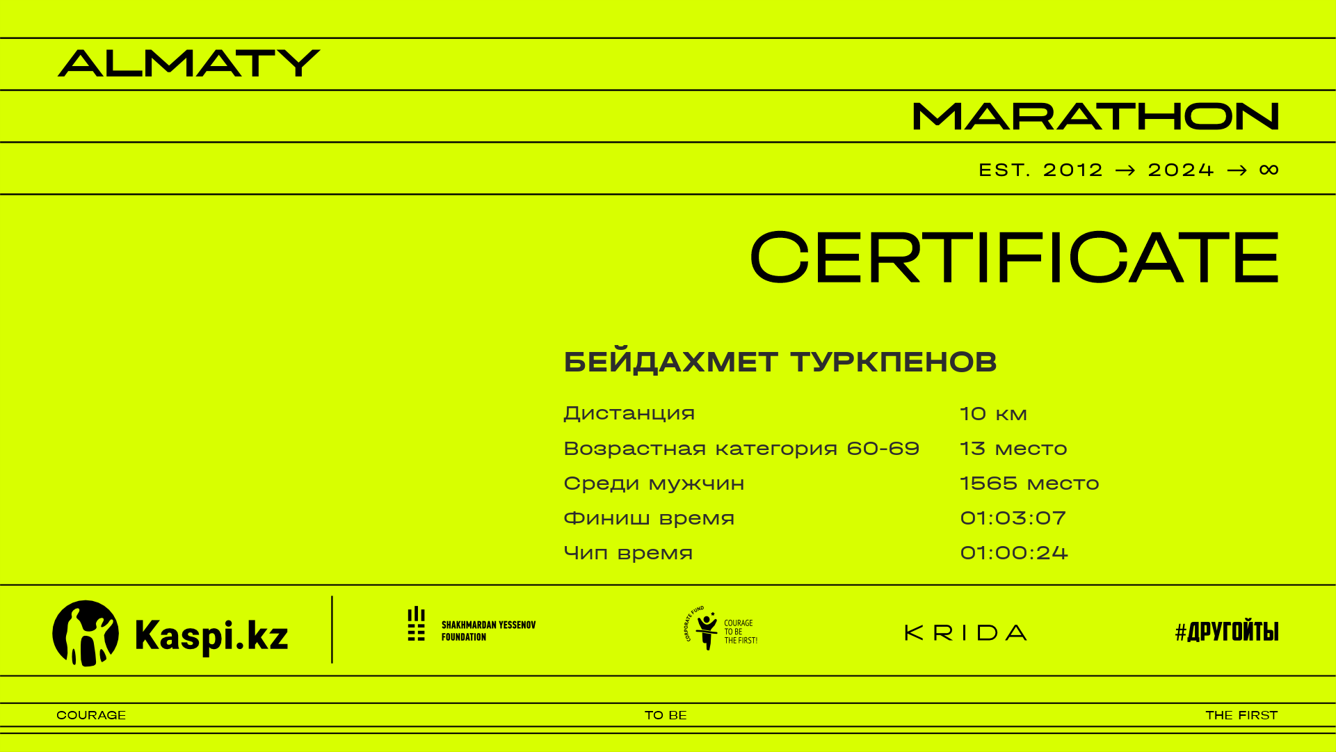 | 2212 | Батыржан Базарбаев | ![]() | Алматы | 14006 | 00:55:59.23 | 01:04:26.15 | 01:03:55.47 | Скачать |