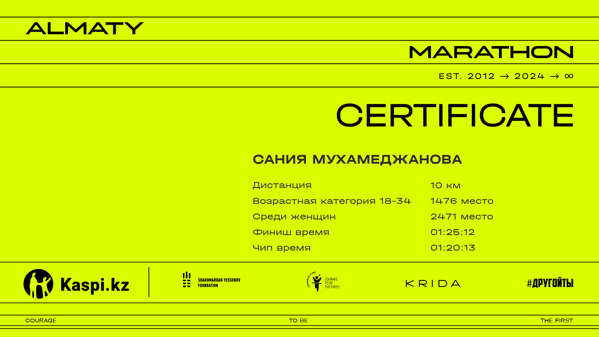 | 6735 | Сания Накиспекова | ![]() | Алматы | 15400 | 01:19:09.77 | 01:29:21.61 | 01:24:58.87 | Скачать |