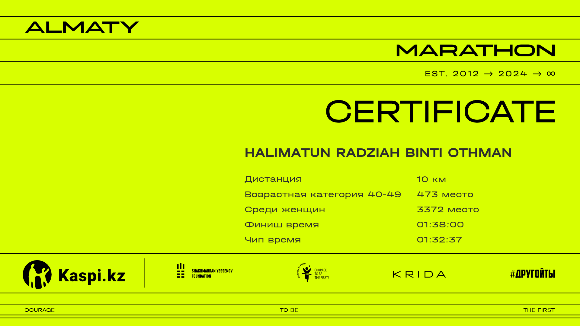 | 7526 | Алима Омаркызы | ![]() | Алматы | 12008 | 01:27:11.00 | 01:38:22.77 | 01:32:44.06 | Скачать |