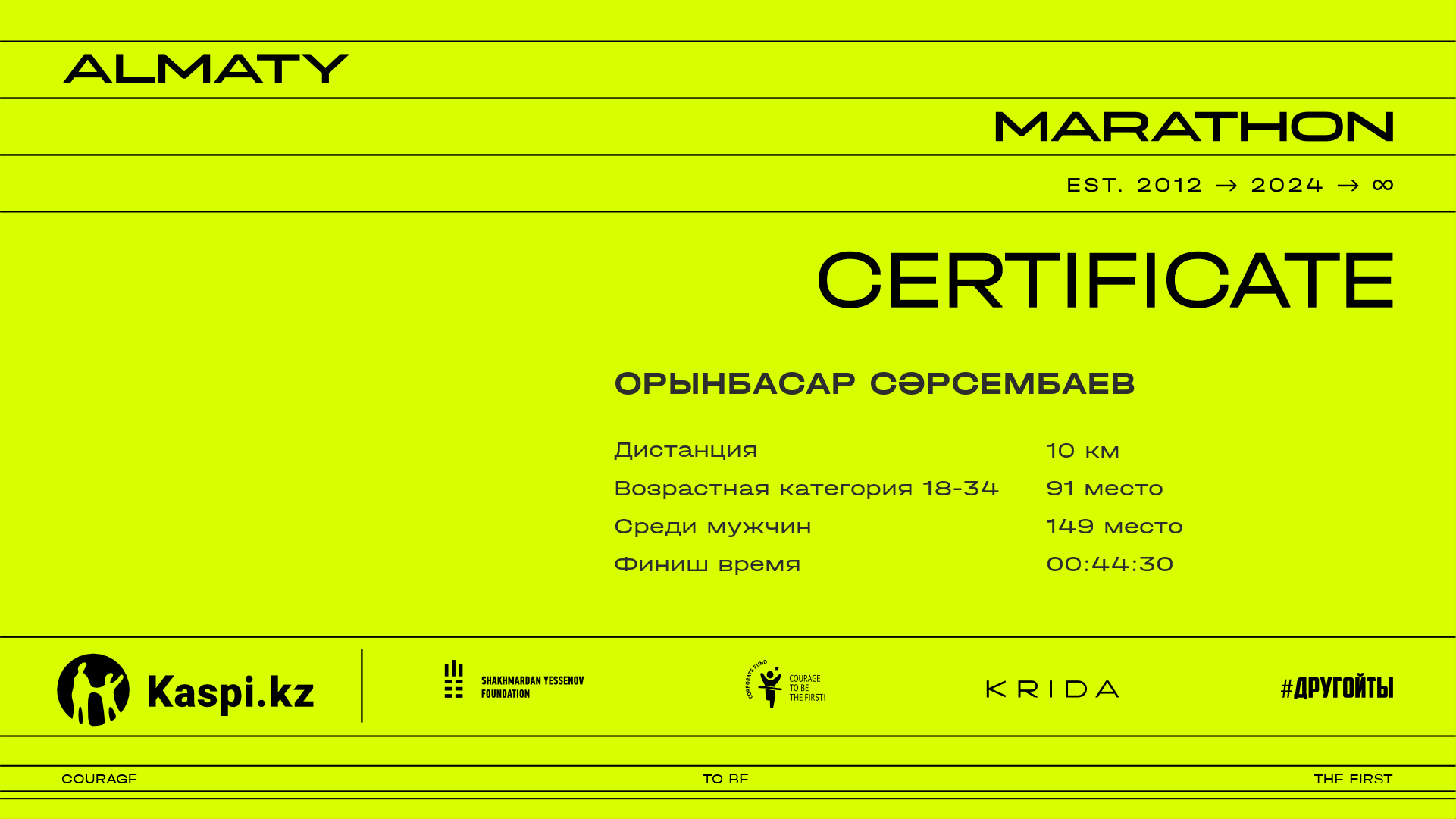 | 152 | Aidar Maukembayev | ![]() | Алматы | 7265 | 00:38:29.11 | 00:44:04.56 | 00:43:43.11 | Скачать |