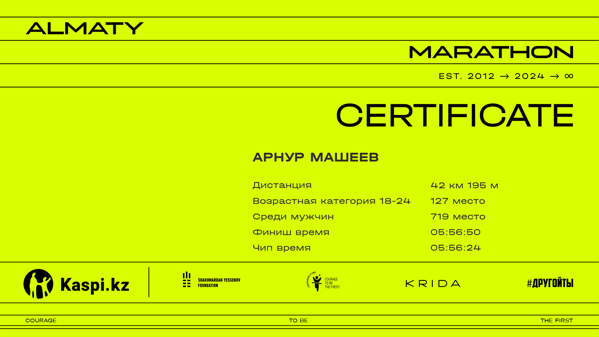 | 817 | Nurken Zhumash | ![]() | Алматы | 821 | 00:56:56.22 | 01:17:25.12 | 02:15:38.28 | 02:25:44.66 | 04:16:39.38 | 05:57:23.59 | 05:57:08.41 | Скачать |