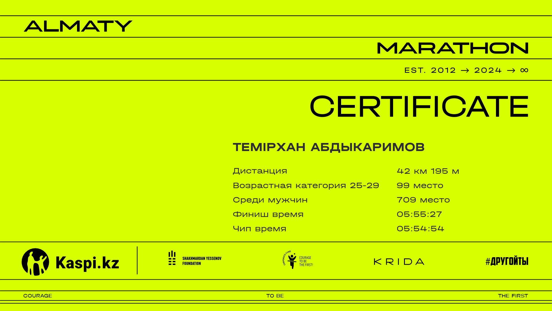| 820 | Amandos Abylay | ![]() | Almaty | 978 | 01:10:34.33 | 01:43:29.05 | 02:48:55.58 | 02:58:49.22 | 05:57:34.21 | 05:57:12.67 | Скачать | |