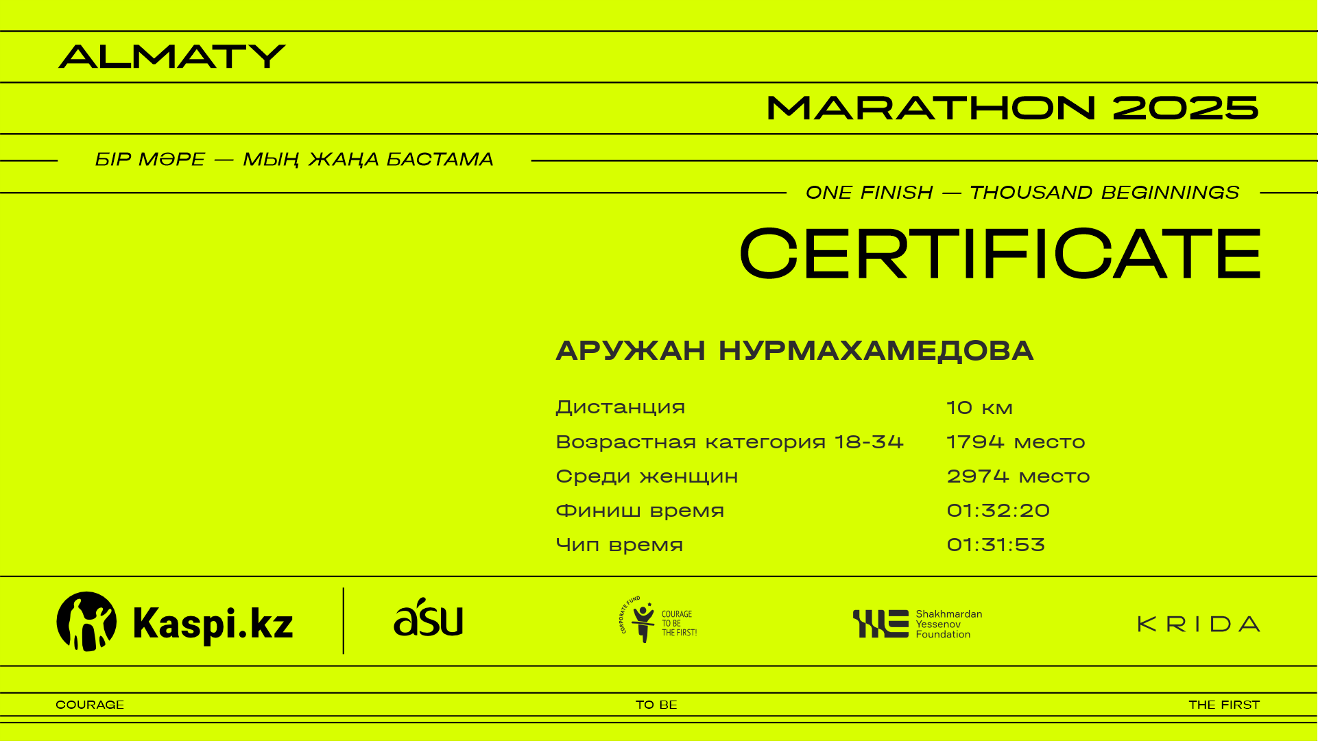 | 2974 | Аружан Нурмахамедова | ![]() | Алматы | 13435 | 01:20:27 | 01:32:20 | 01:31:53 | Скачать |