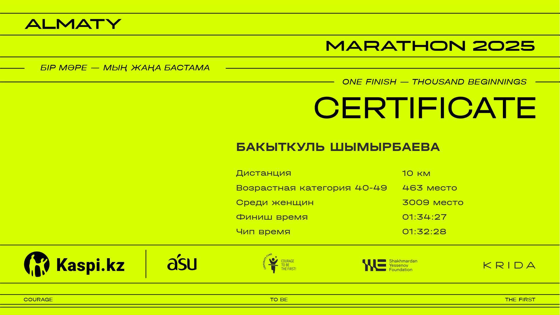 | 3005 | Айгул Мангал | ![]() | Алматы | 6979 | 01:20:26 | 01:33:19 | 01:32:25 | Скачать |