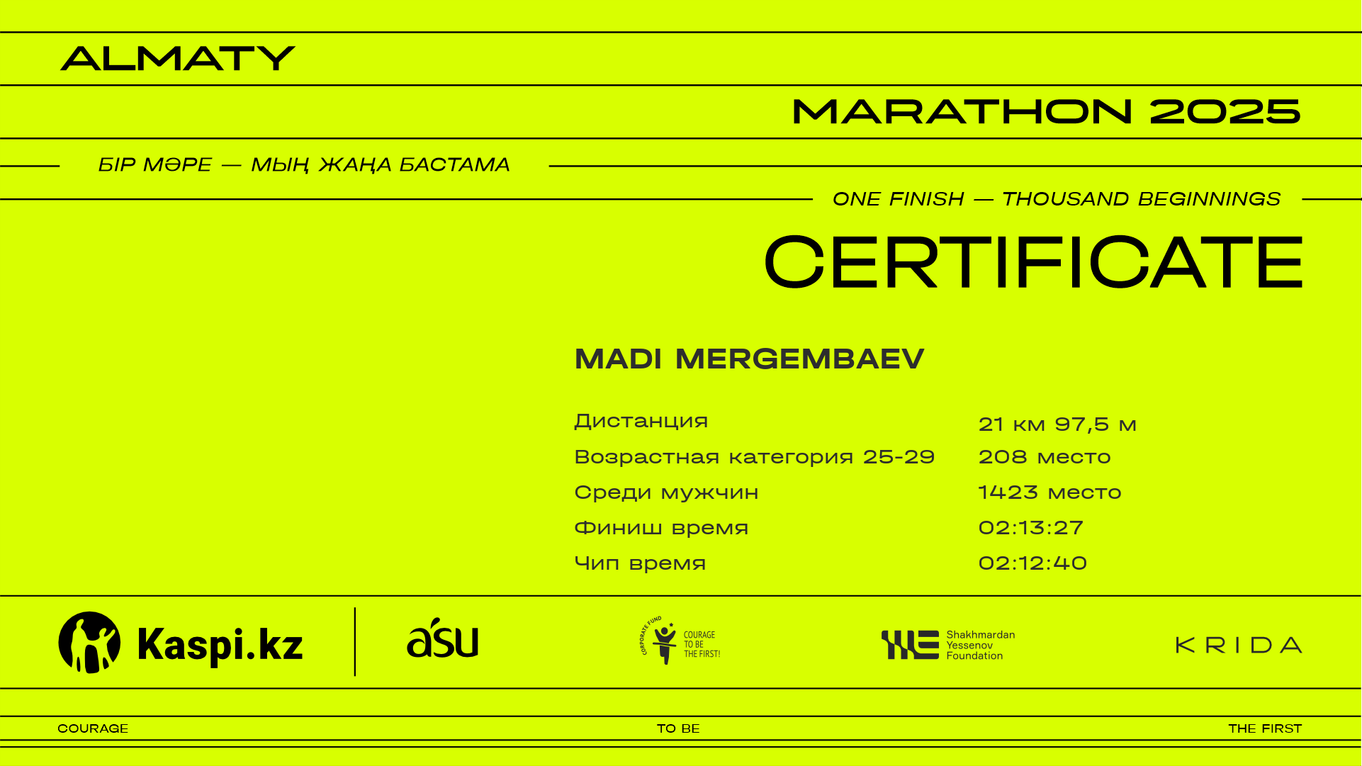 | 2604 | Assel Alimzhan | ![]() | Алматы | 2885 | 00:37:00 | 01:11:55 | 01:44:45 | 02:24:03 | 02:32:58 | 02:32:07 | Скачать |