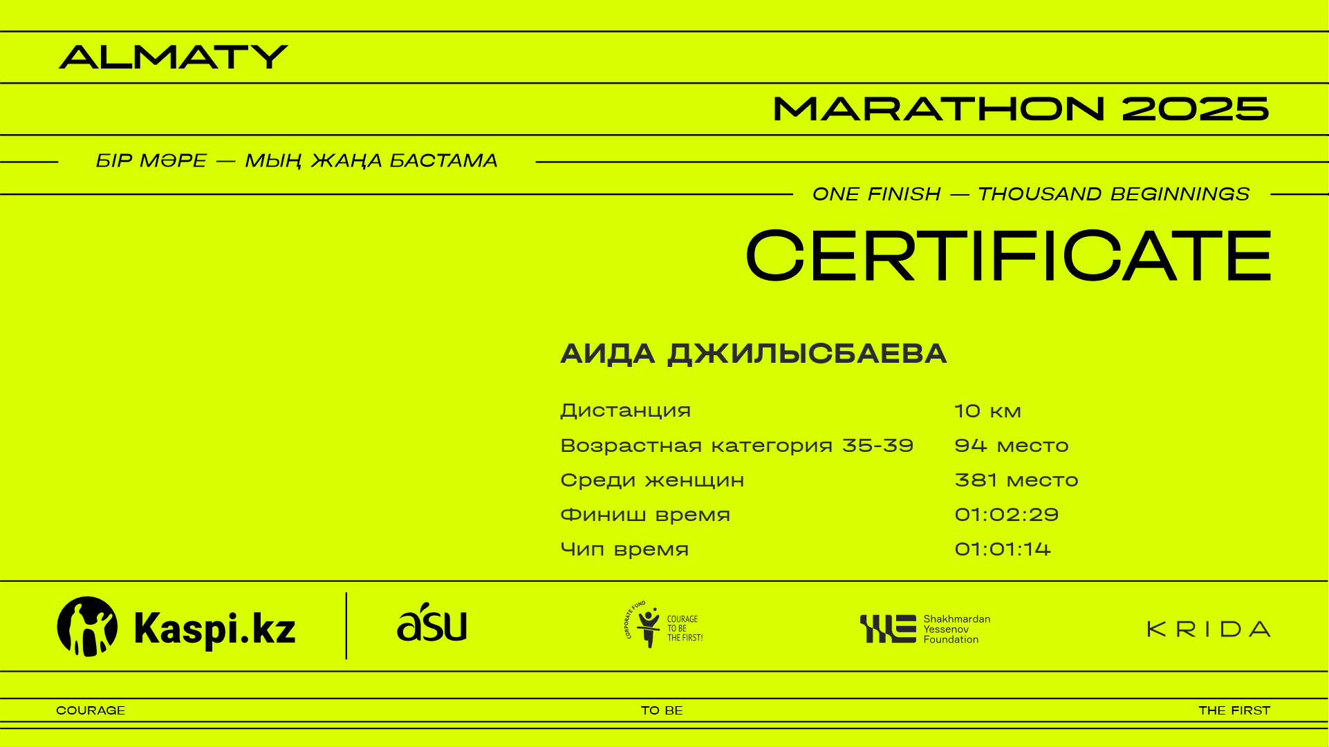 | 375 | Гулжан Алдикул | ![]() | Алматы | 9621 | 00:53:44 | 01:01:30 | 01:01:05 | Скачать |