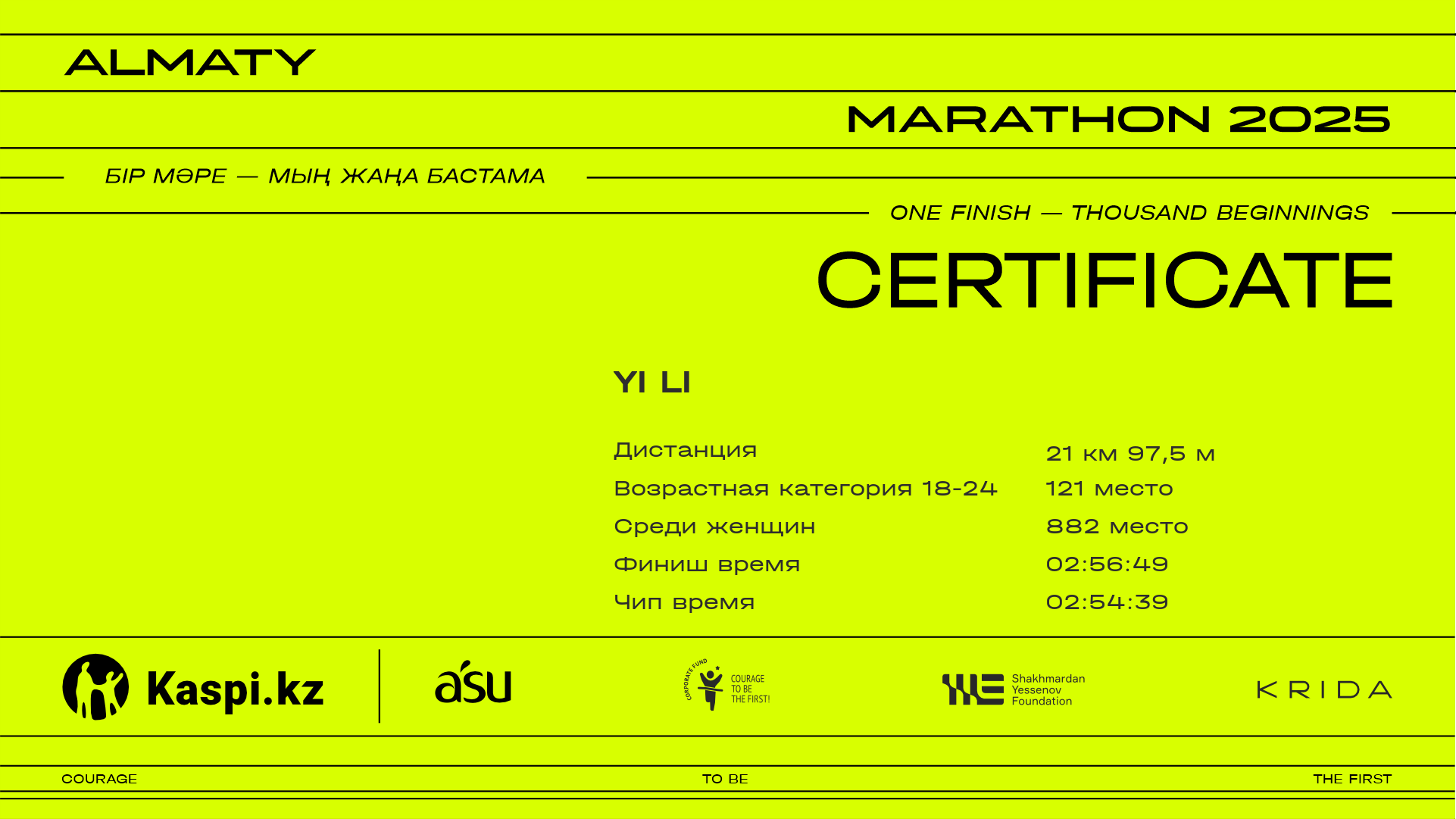 | 507 | Риналья Кудайбергенова | ![]() | Семей | 5204 | 00:25:28 | 00:50:53 | 01:14:36 | 01:42:48 | 01:48:49 | 01:48:46 | Скачать |