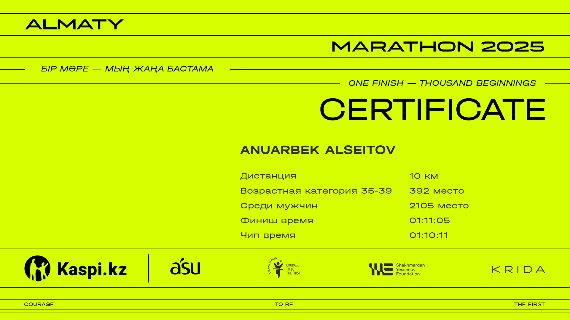 | 3556 | Anuar Japbassov | ![]() | Алматы | 13715 | 01:03:29 | 01:13:09 | 01:12:40 | Скачать |