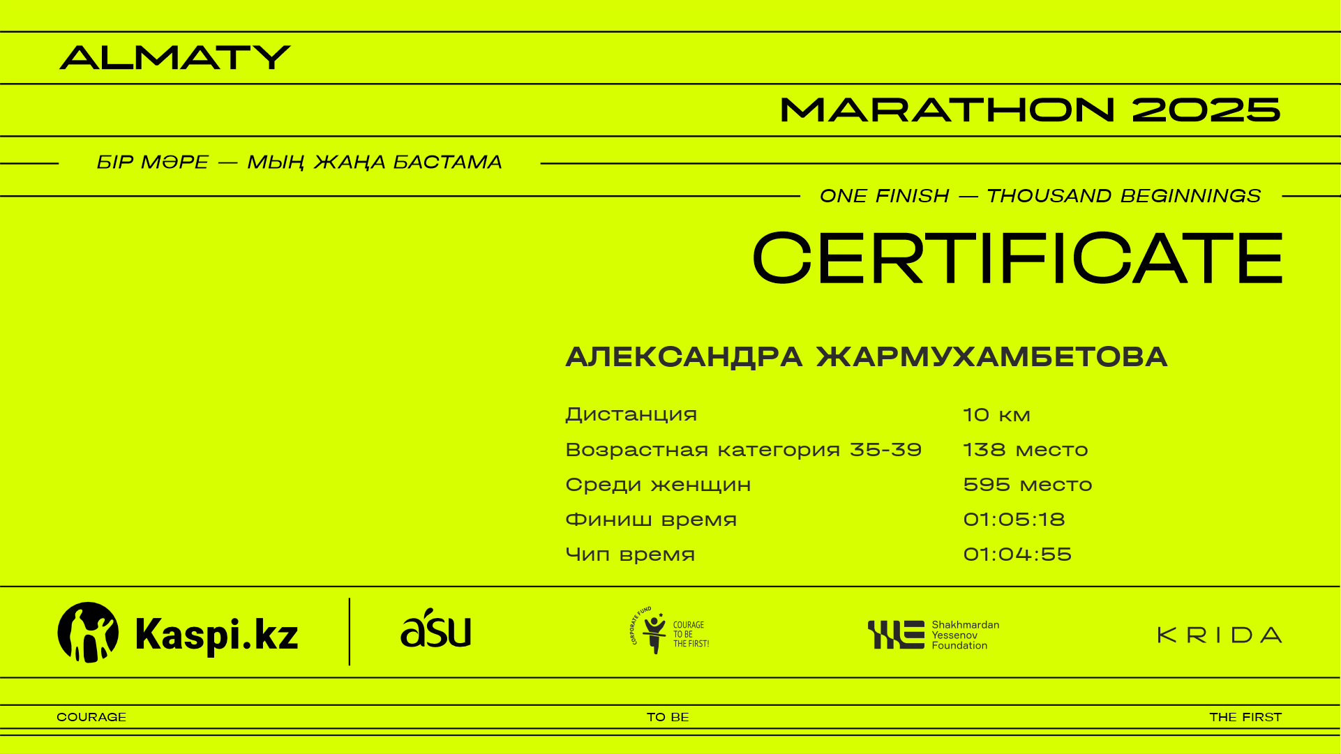 | 595 | Александра Жармухамбетова | ![]() | Алматы | 6671 | 00:57:02 | 01:05:18 | 01:04:55 | Скачать |