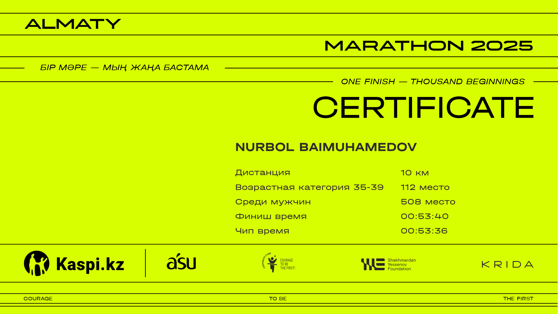 | 623 | NURBOL Baimuhamedov | ![]() | Астана | 8059 | 00:46:05 | 00:53:40 | 00:53:36 | Скачать |