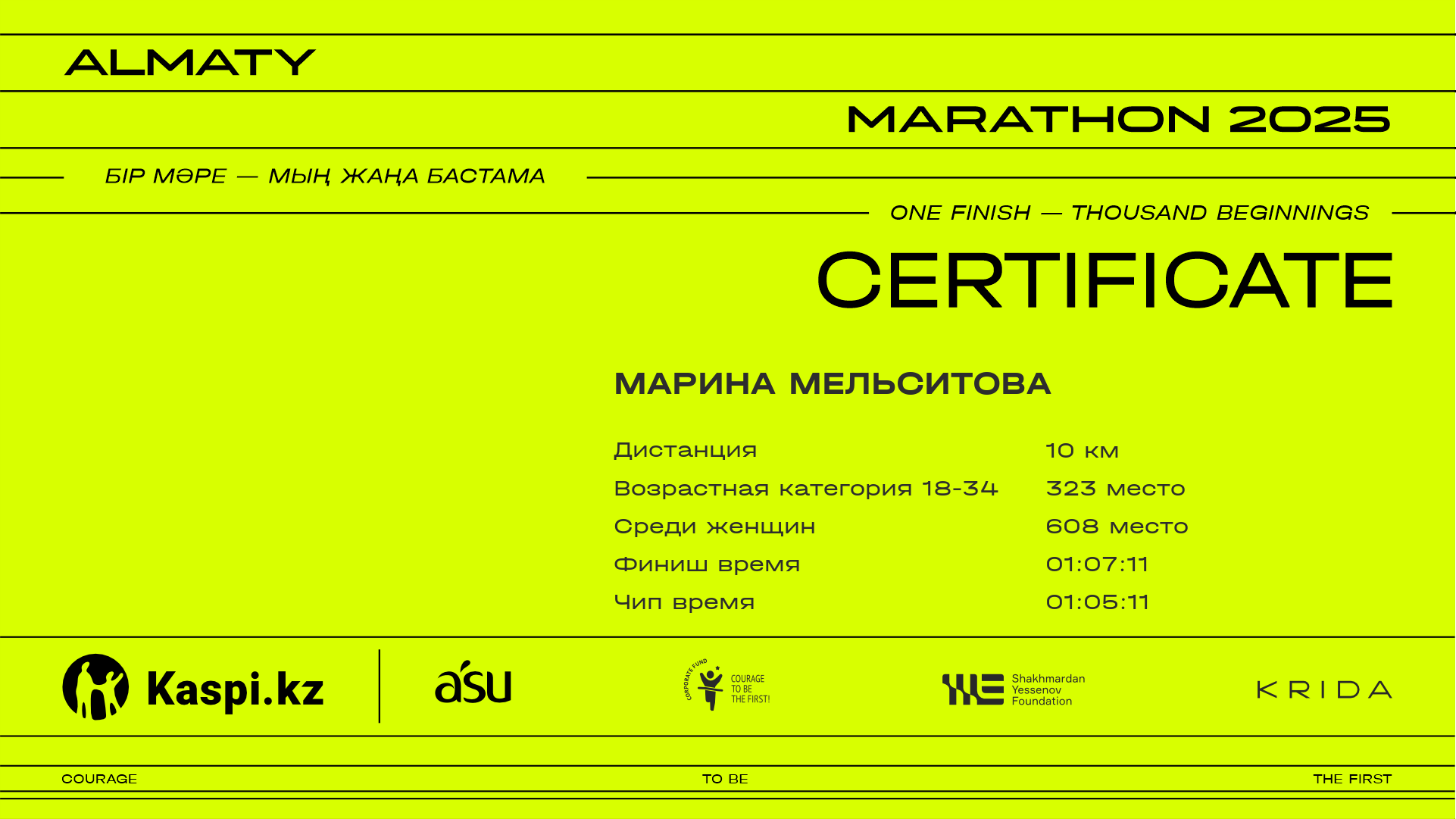 | 622 | Sabina Kusmankulova | ![]() | Алматы | 13990 | 00:57:41 | 01:05:53 | 01:05:22 | Скачать |
