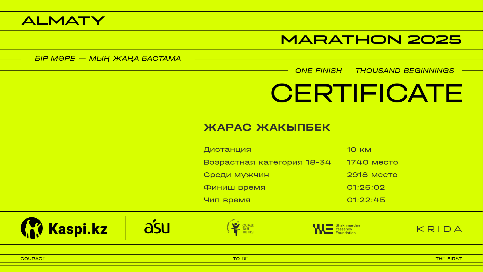 | 5177 | Жарас Жакыпбек | ![]() | Алматы | 12783 | 01:13:43 | 01:25:02 | 01:22:45 | Скачать |