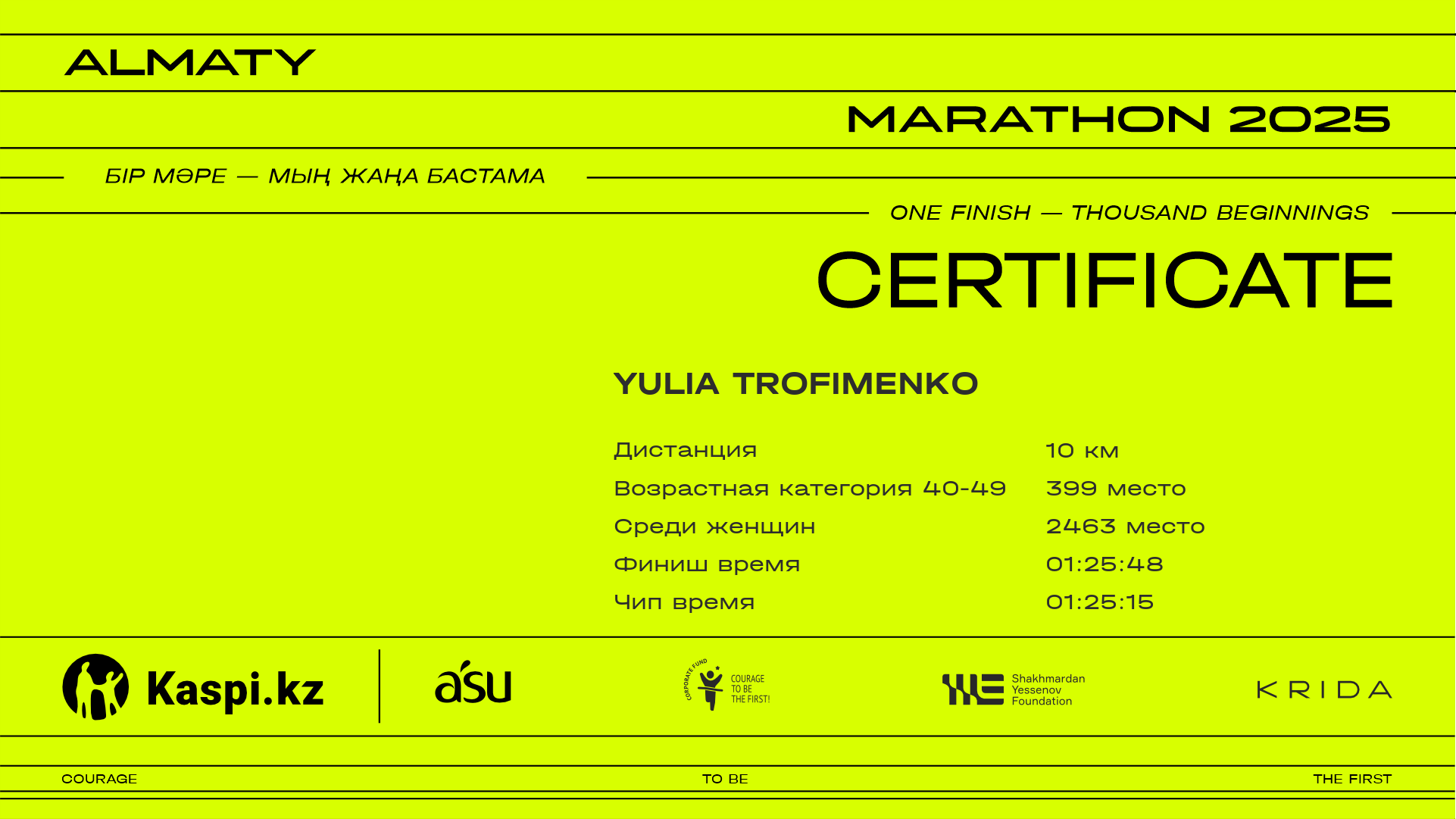 | 5462 | Yulia Trofimenko | ![]() | Астана | 13955 | 01:16:00 | 01:25:48 | 01:25:15 | Скачать |