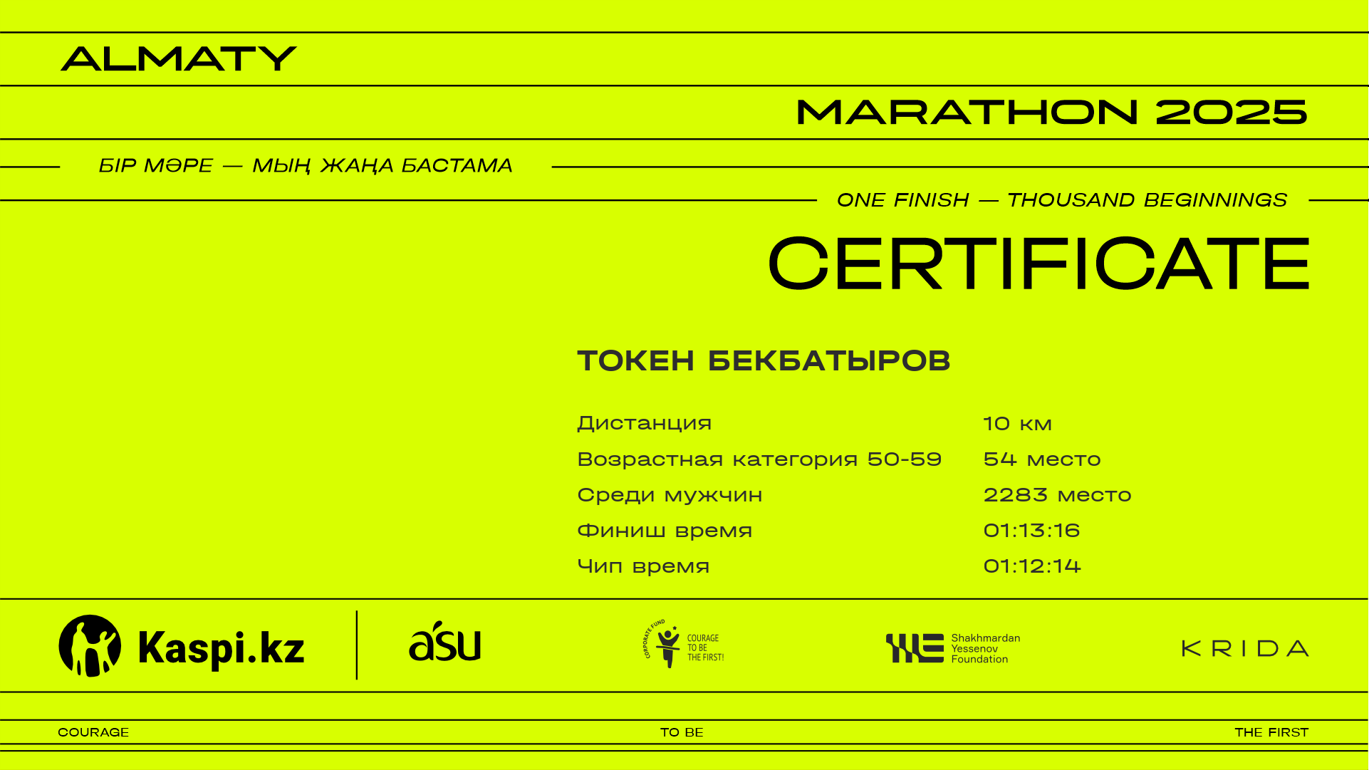 | 5482 | Томирис Ашимова | ![]() | Алматы | 6521 | 01:13:52 | 01:26:00 | 01:25:25 | Скачать |