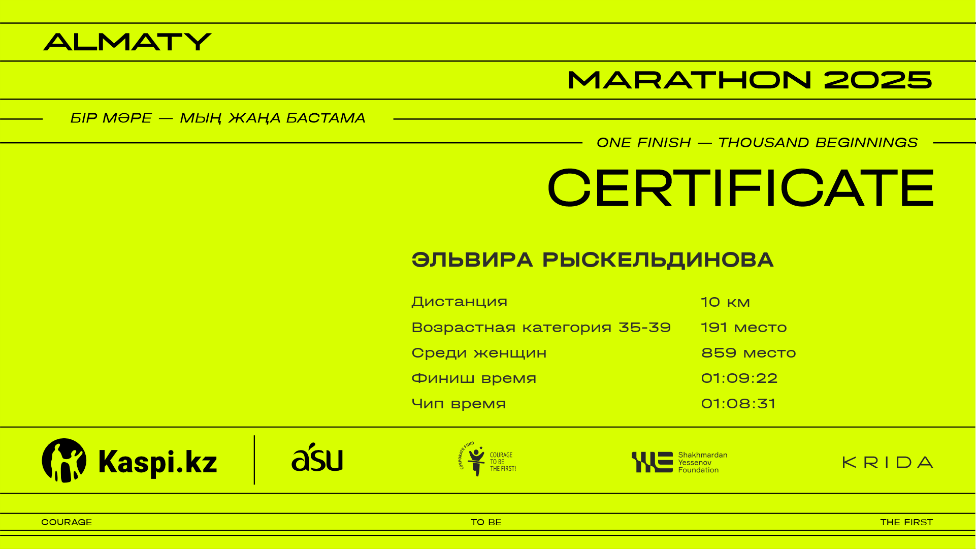 | 834 | Айгерім Хамит | ![]() | Алматы | 8040 | 00:59:45 | 01:09:43 | 01:08:18 | Скачать |