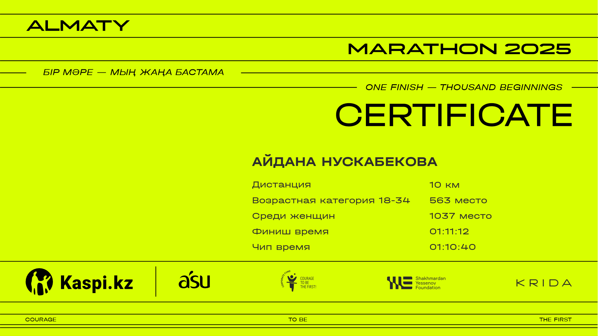| 1037 | Айдана Нускабекова | ![]() | Шымкент | 8696 | 01:02:01 | 01:11:12 | 01:10:40 | Скачать |