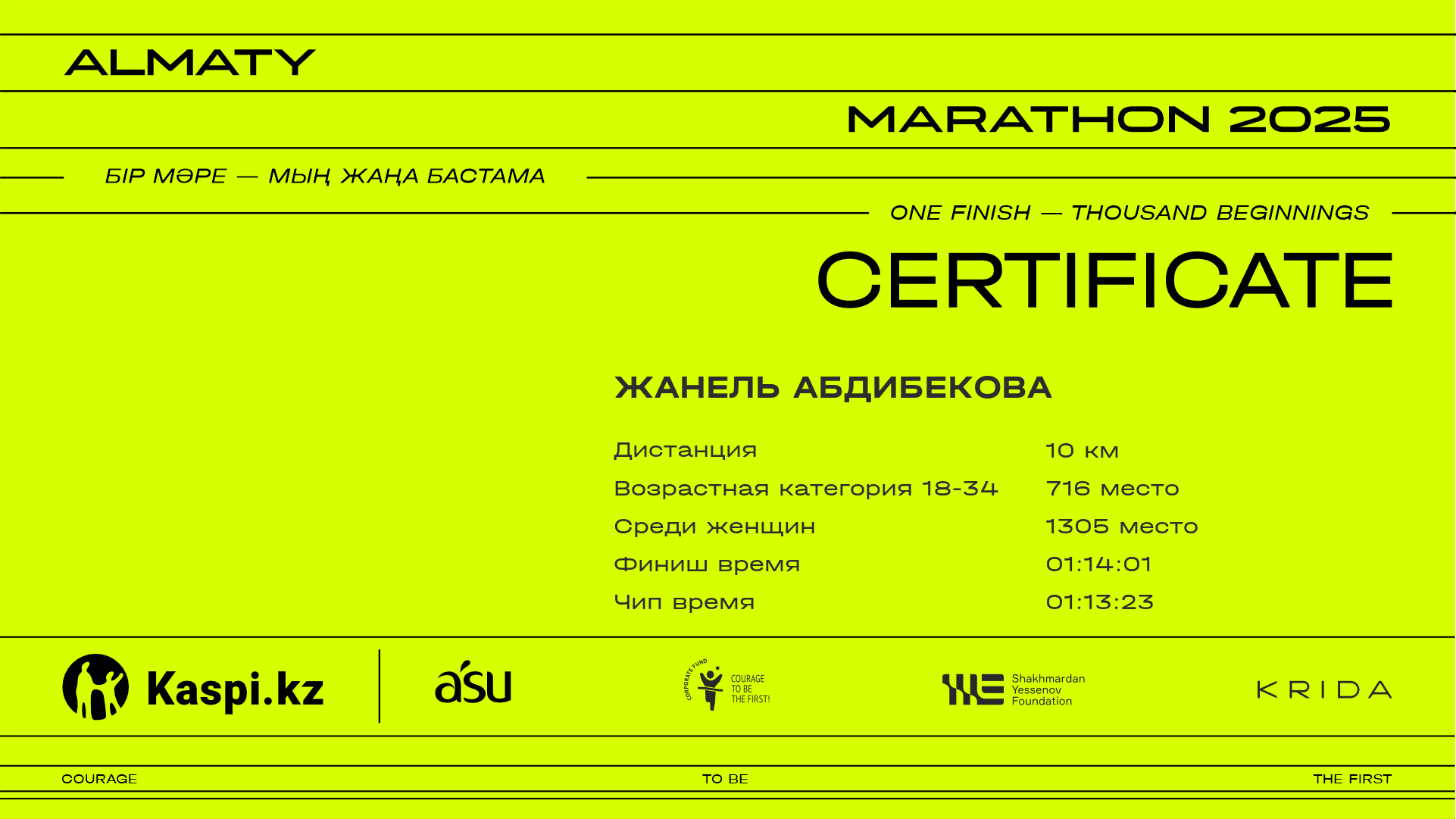 | 1305 | Жанель Абдибекова | ![]() | Алматы | 14662 | 01:04:39 | 01:14:01 | 01:13:23 | Скачать |