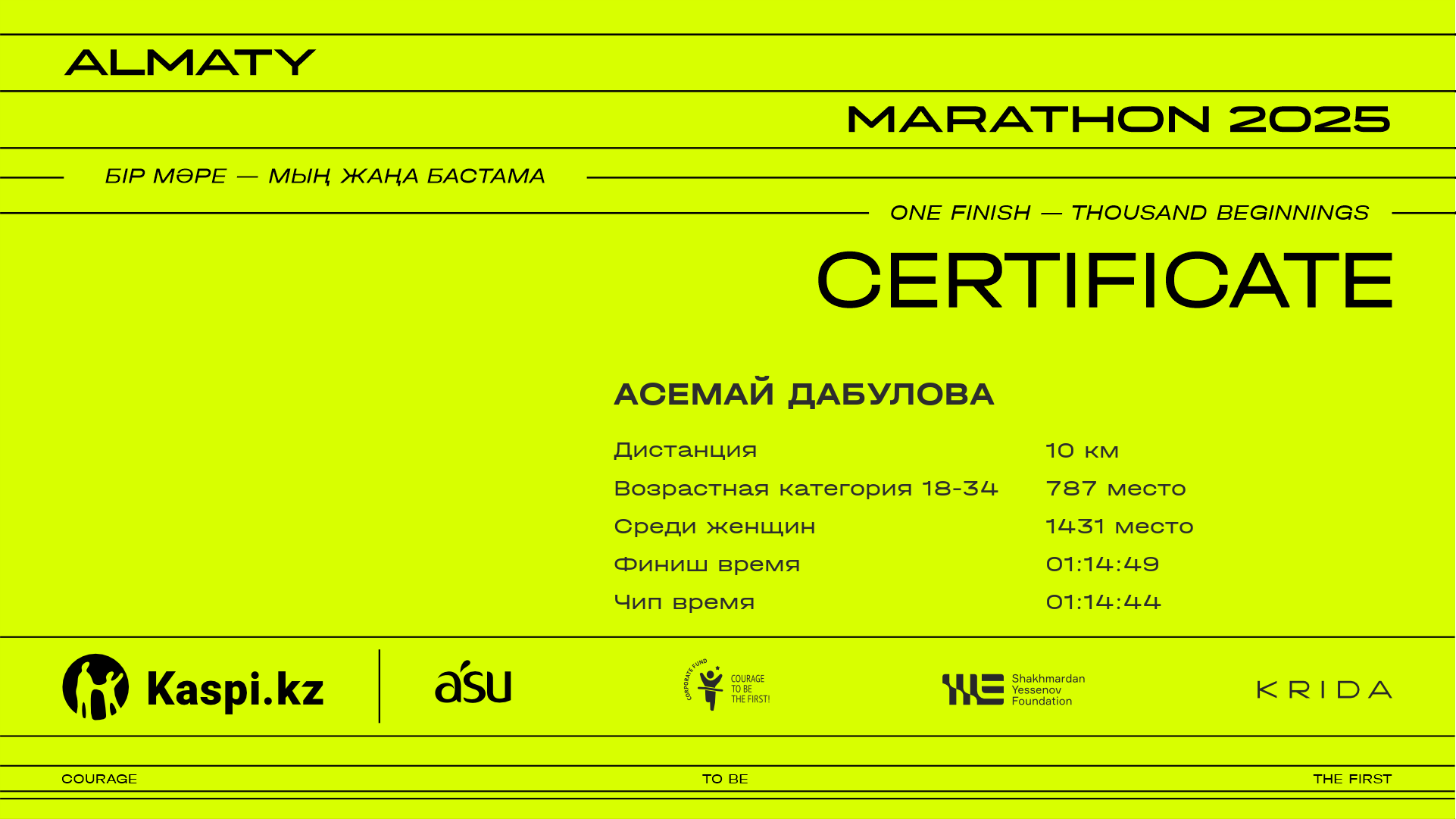 | 1408 | Balym Zhassybek | ![]() | Астана | 13975 | 01:05:32 | 01:15:01 | 01:14:28 | Скачать |