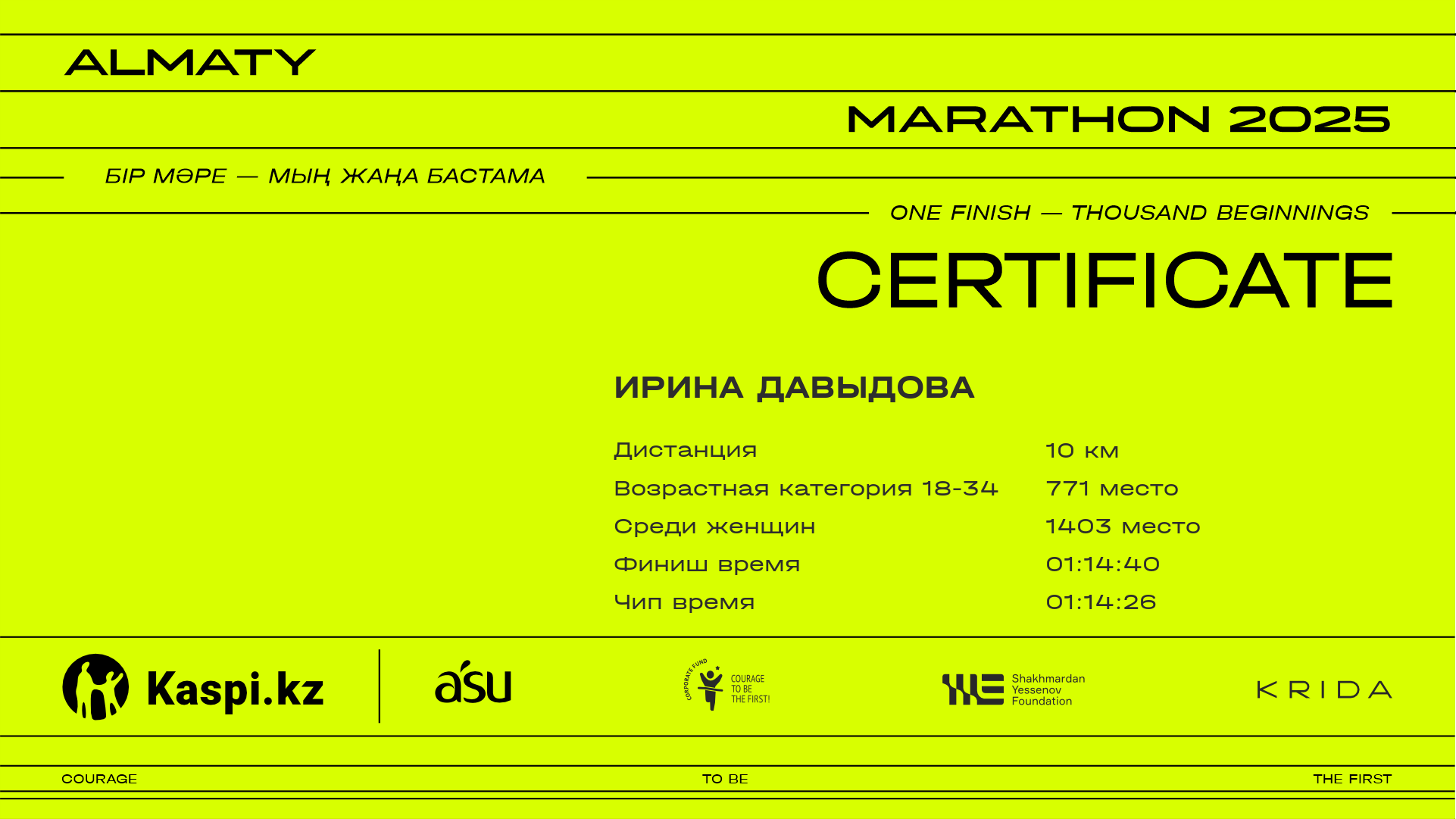 | 1403 | Ирина Давыдова | ![]() | Алматы | 9102 | 01:05:35 | 01:14:40 | 01:14:26 | Скачать |