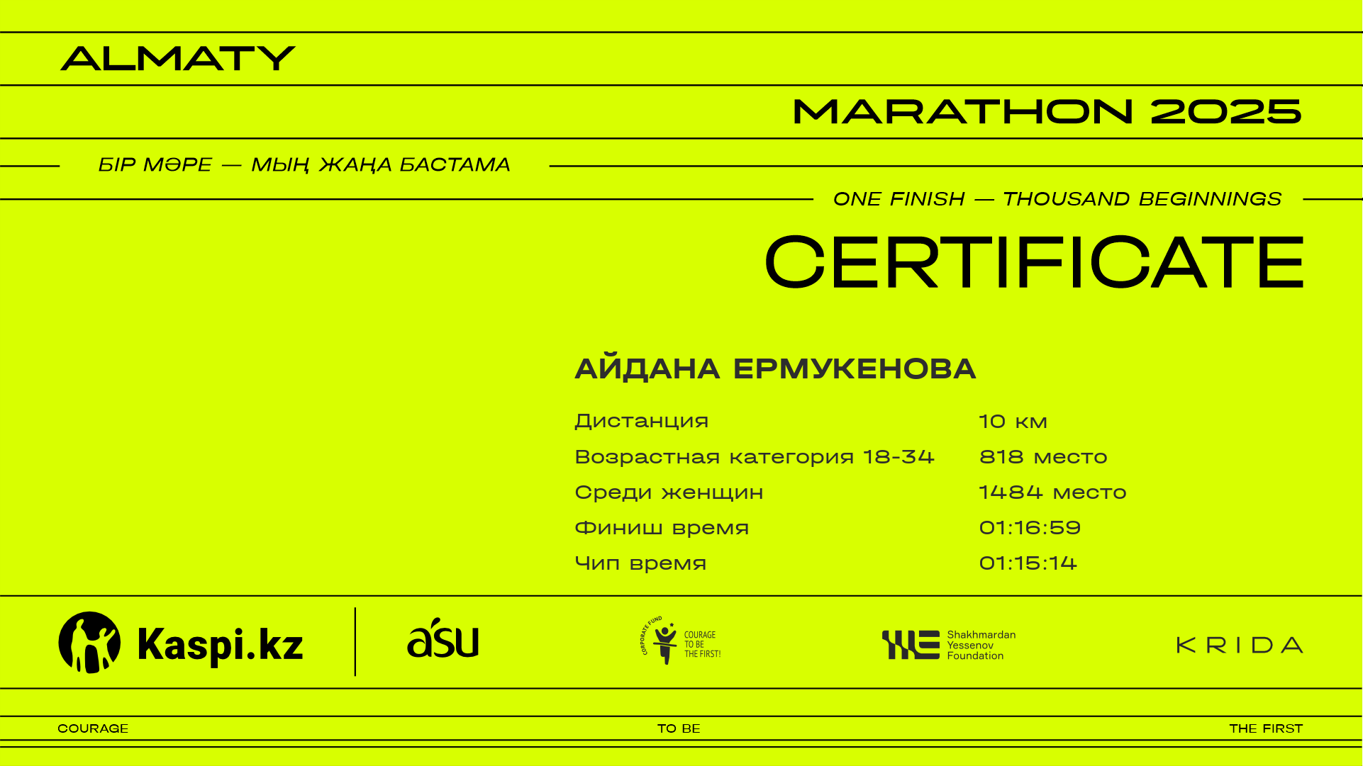 | 1485 | Kaliya Tabynbay | ![]() | Алматы | 10903 | 01:06:00 | 01:15:56 | 01:15:15 | Скачать |