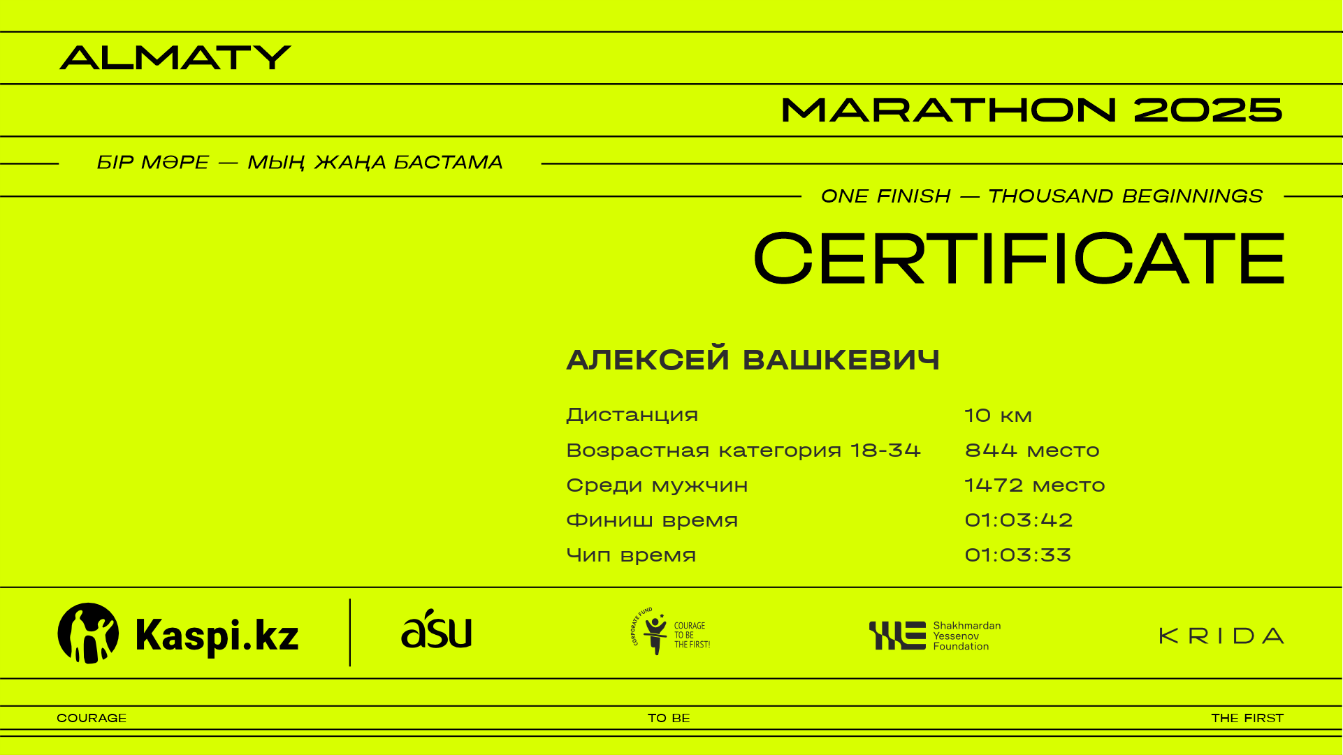 | 5350 | Vladislav Nikolaev | ![]() | Алматы | 12964 | 01:13:24 | 01:26:27 | 01:24:10 | Скачать |