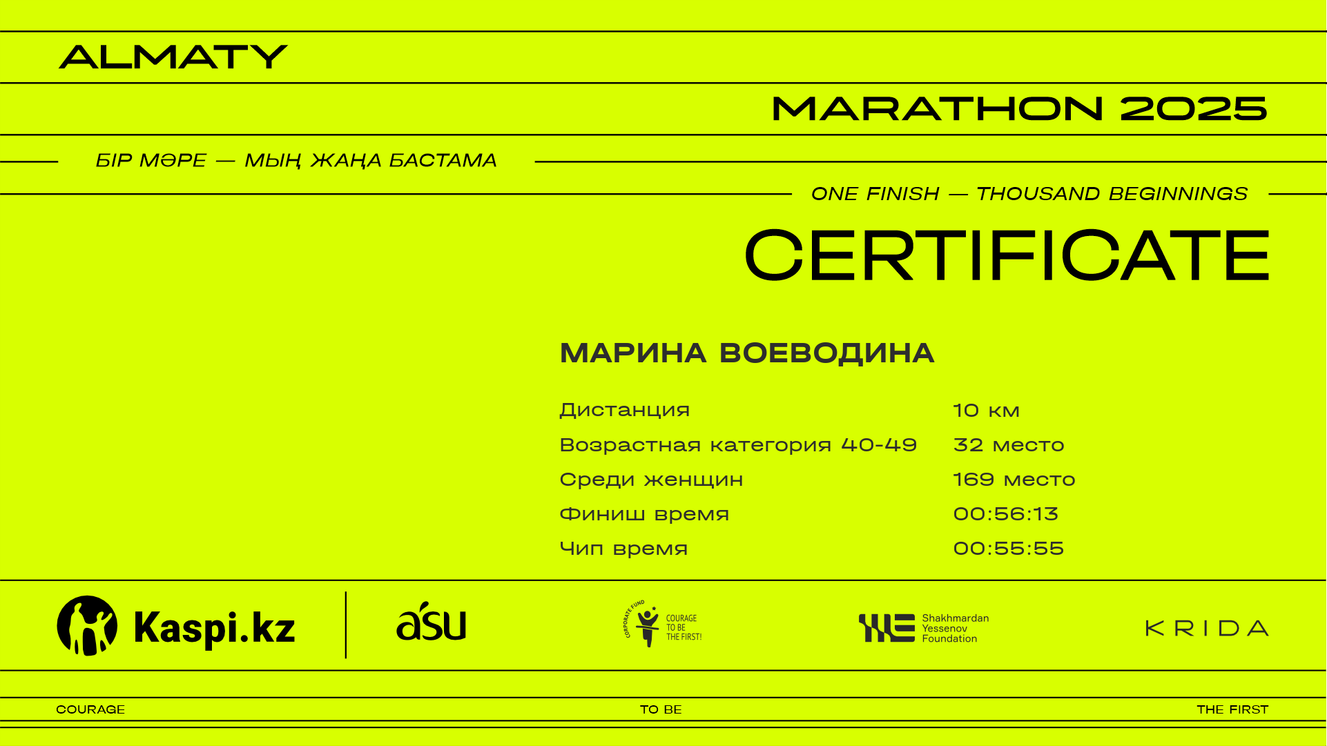 | 170 | Меруерт Козбакова | ![]() | Алматы | 8567 | 00:48:40 | 00:56:17 | 00:55:57 | Скачать |