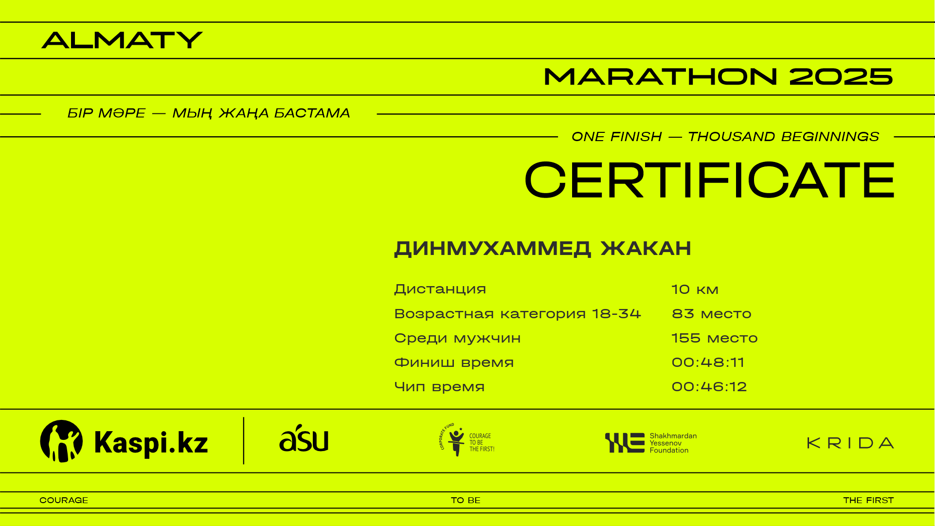 | 181 | Динмухаммед Жакан | ![]() | Талгар | 8354 | 00:40:51 | 00:48:11 | 00:46:12 | Скачать |