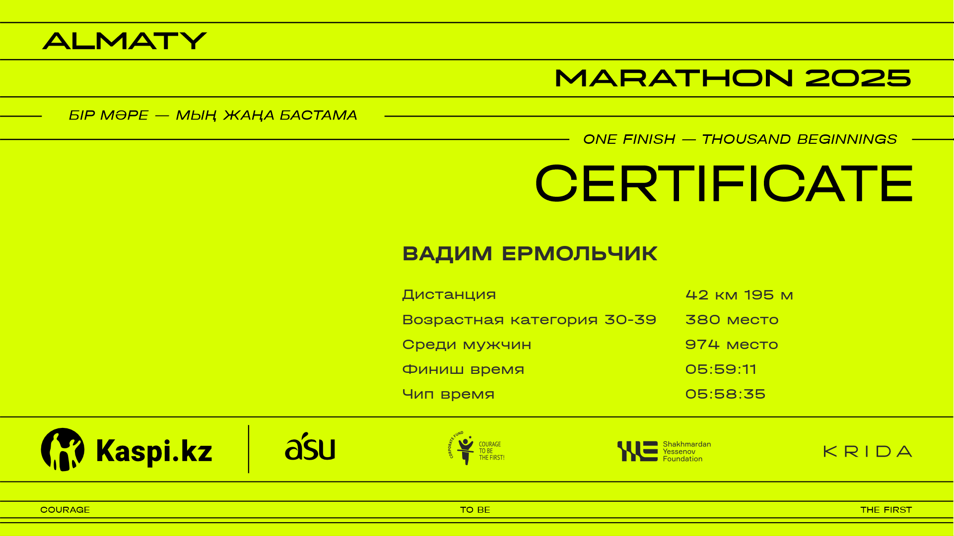 | 1111 | Nuralem Ahmetzhan | ![]() | Уральск | 1137 | 00:38:02 | 01:16:38 | 01:50:40 | 02:30:50 | 02:40:04 | 03:25:25 | 04:11:33 | 05:00:03 | 05:47:41 | 05:57:27 | 05:57:07 | Скачать |