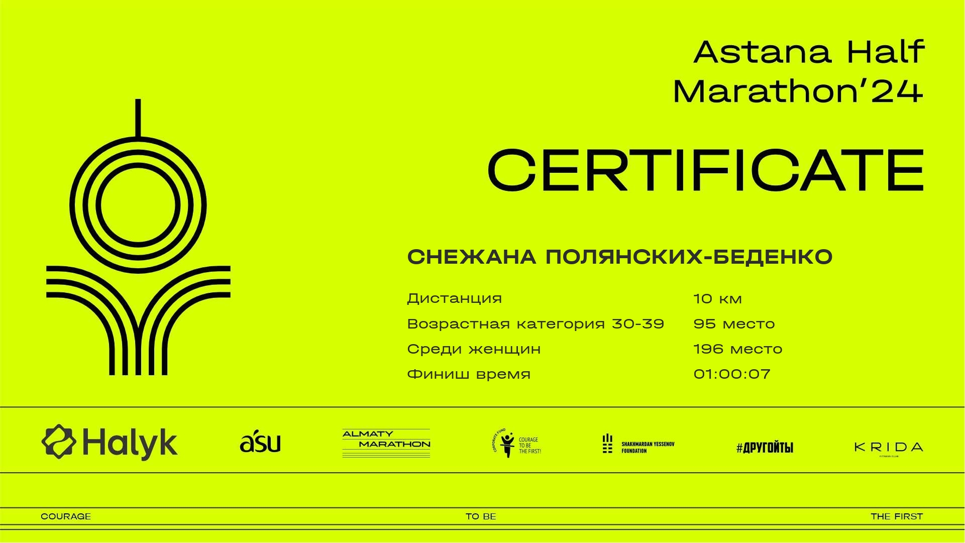 | 3513 | Сымбат Жанбырбек | ![]() | Астана | 5908 | 00:36:35.61 | 01:25:38.86 | 01:34:57.35 | 01:32:22.40 | Скачать |