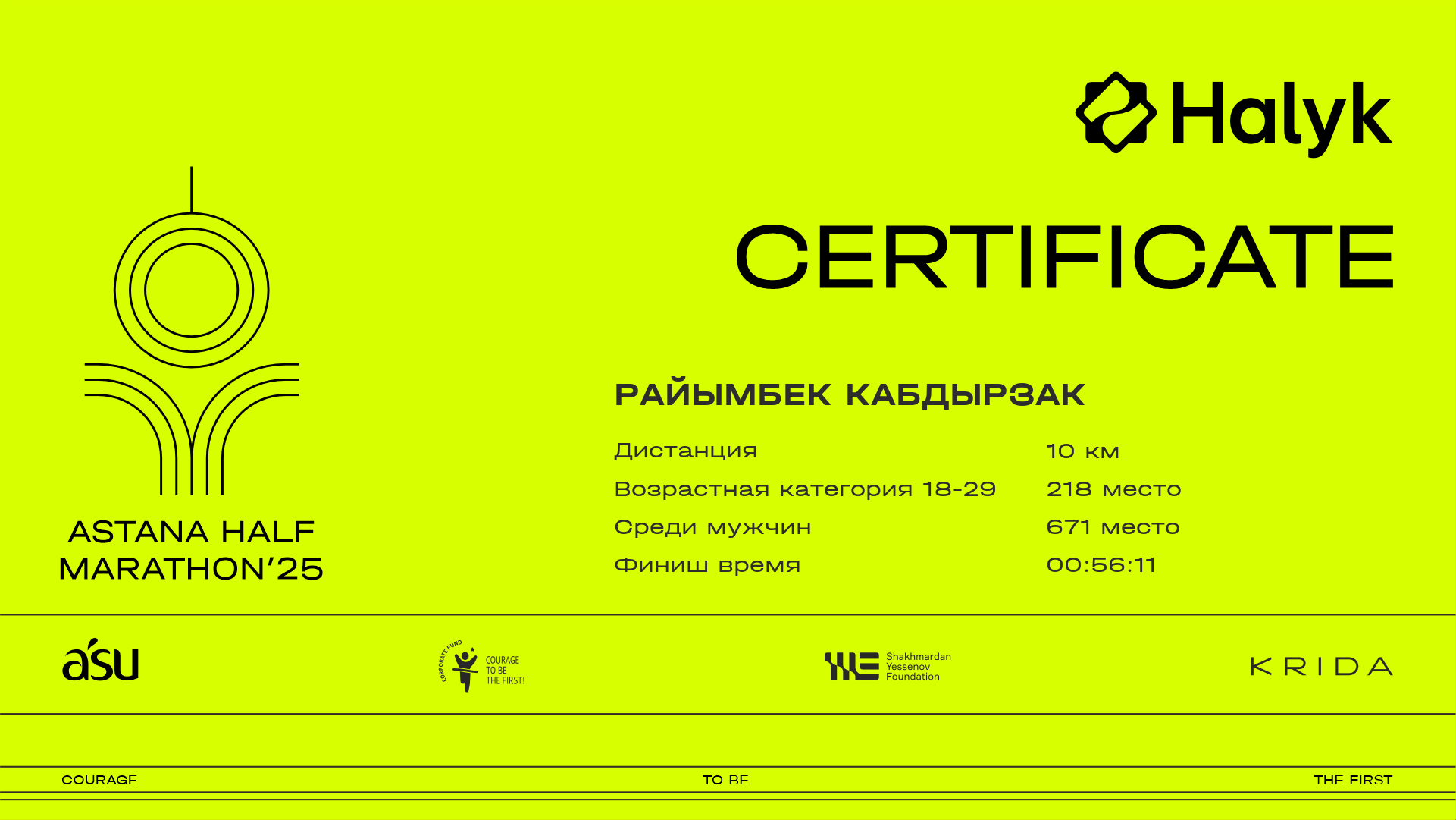| 807 | Райымбек Кабдырзак | ![]() | Астана | 6365 | 00:31:56 | 00:56:11 | 00:55:26 | Скачать |