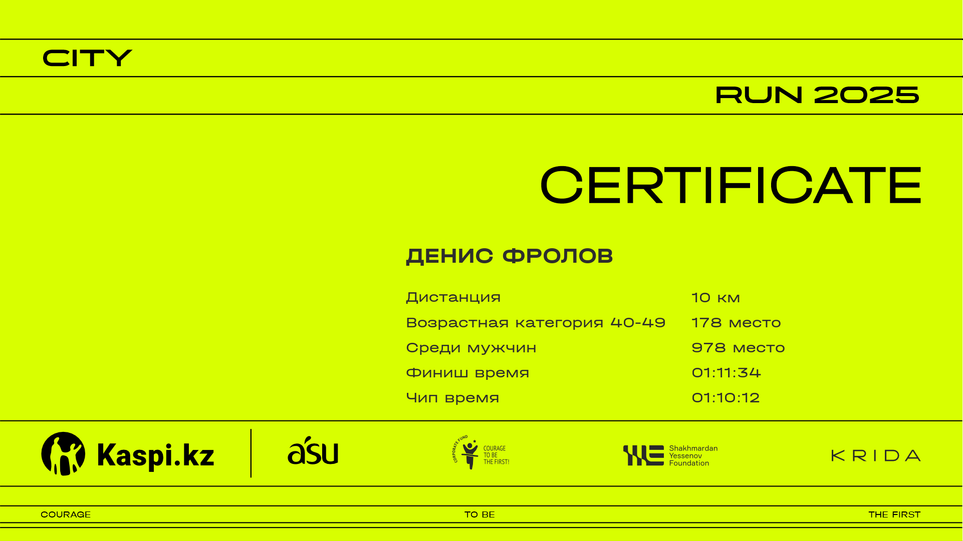 | 1473 | Денис Фролов | ![]() | Алматы | 2441 | 00:20:07 | 00:32:35 | 00:45:40 | 00:59:33 | 01:10:10 | 01:11:34 | 01:10:12 | Скачать |