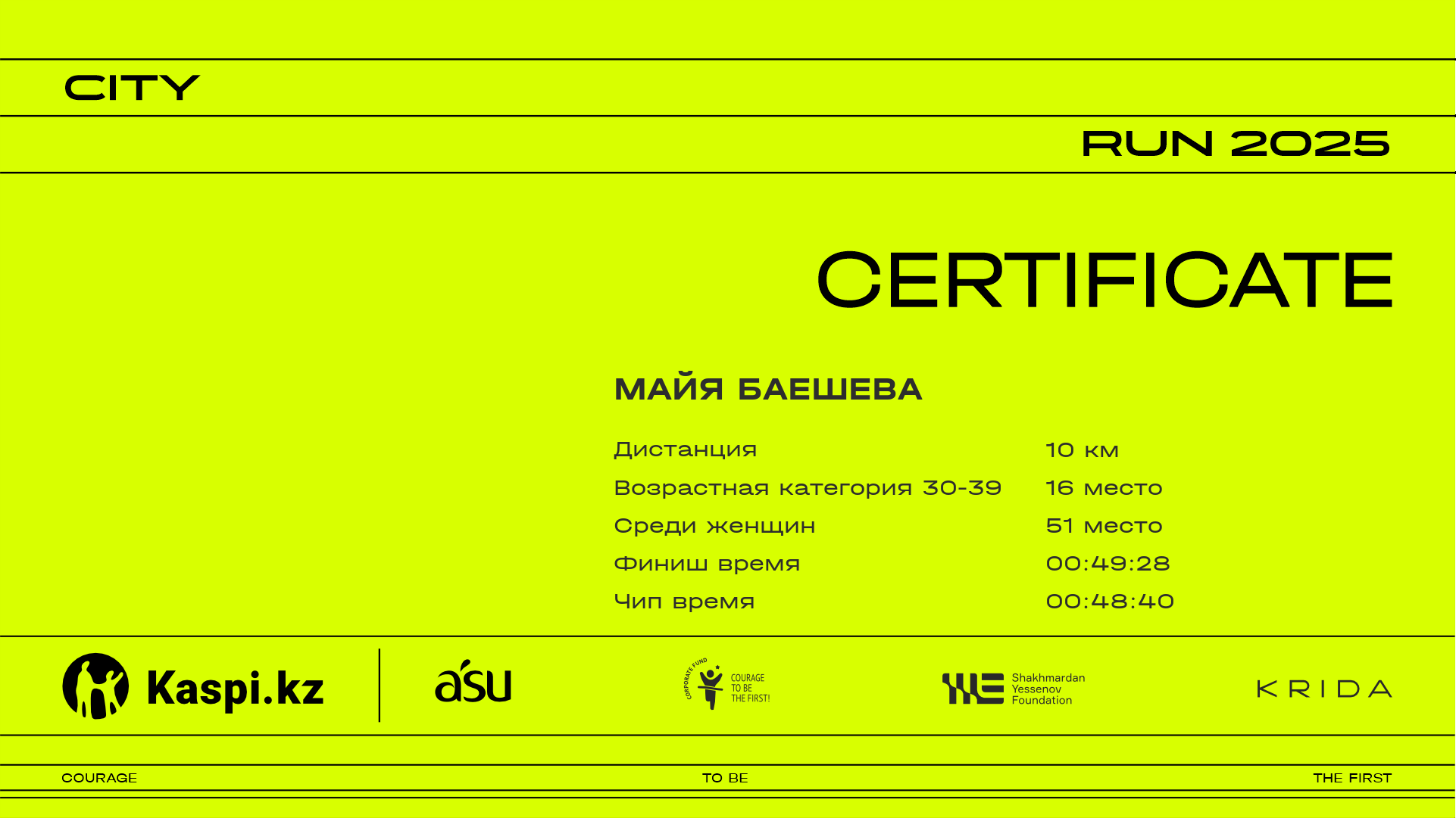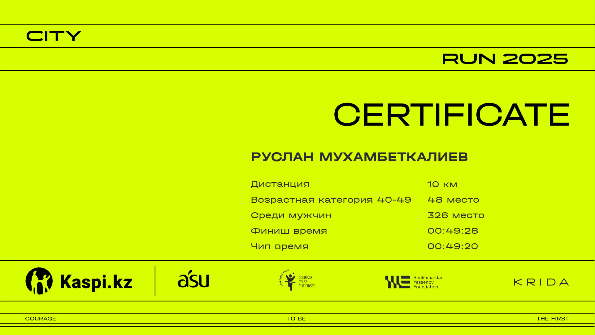 | 388 | Yernar Altynbekov | ![]() | Алматы | 1932 | 00:12:50 | 00:21:44 | 00:31:22 | 00:41:11 | 00:48:36 | 00:49:47 | 00:49:37 | Скачать |